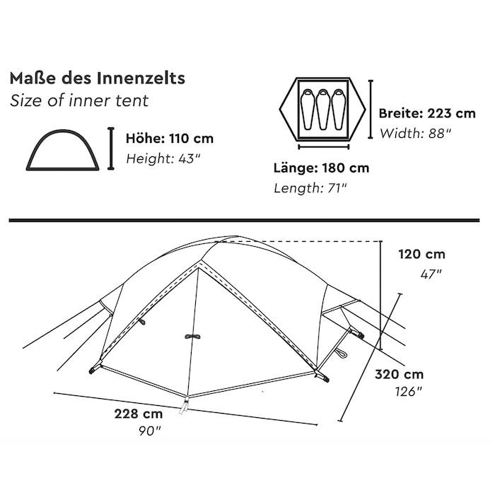Ulkoteltan mitat ovat noin 320 × 228 × 120 cm (P × L × K), joten TIKONA 3 tarjoaa reilusti sisätilaa säilyttäen silti kompaktin pystytysalan. Sisäteltan mitat ovat noin 223 × 180 × 110 cm, ja se soveltuu mukavasti jopa kolmelle hengelle. Kupolirakenne mahdollistaa tasaisen tilankäytön, hyvän pääntilan ja korkean vakauden vaihtelevissa sääolosuhteissa.