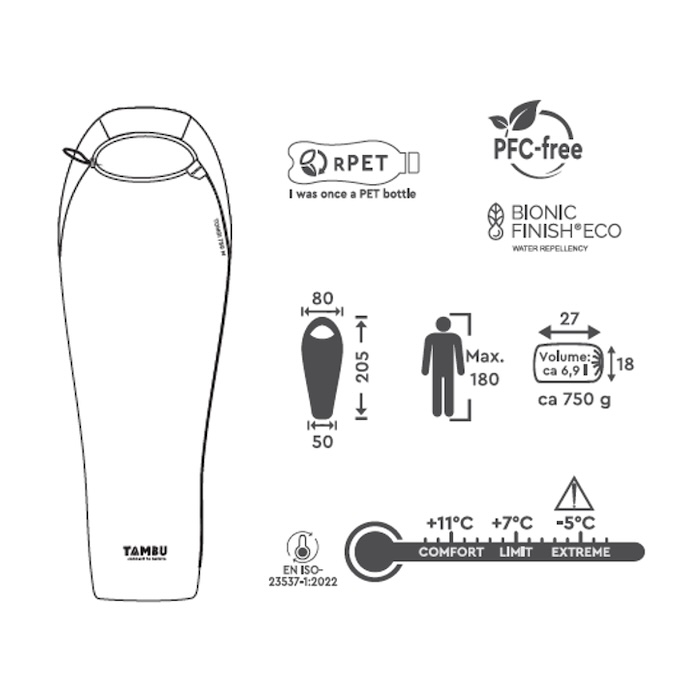 TONGI 750 M TAMBUlta on ihanteellinen makuupussi kaikille, jotka arvostavat kevyttä varustusta ja ympäristöystävällisiä materiaaleja. Vain noin 750 g painollaan ja kompaktilla noin 28 × 19 × 19 cm pakkauskoollaan se kulkee helposti mukana ja vie repussa vain vähän tilaa – täydellinen vaelluksille, leirintäretkille, pyörämatkoille tai festareille.