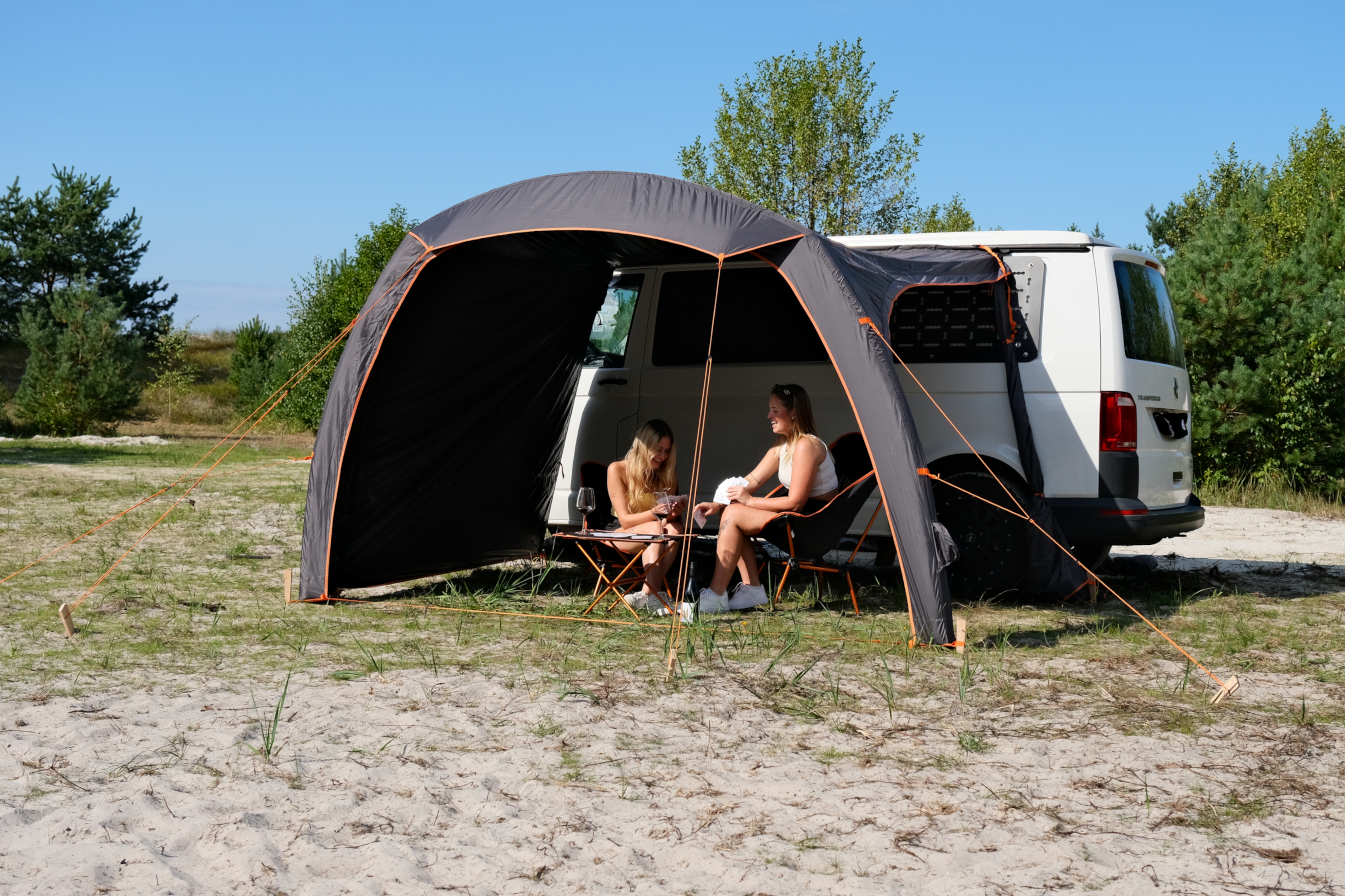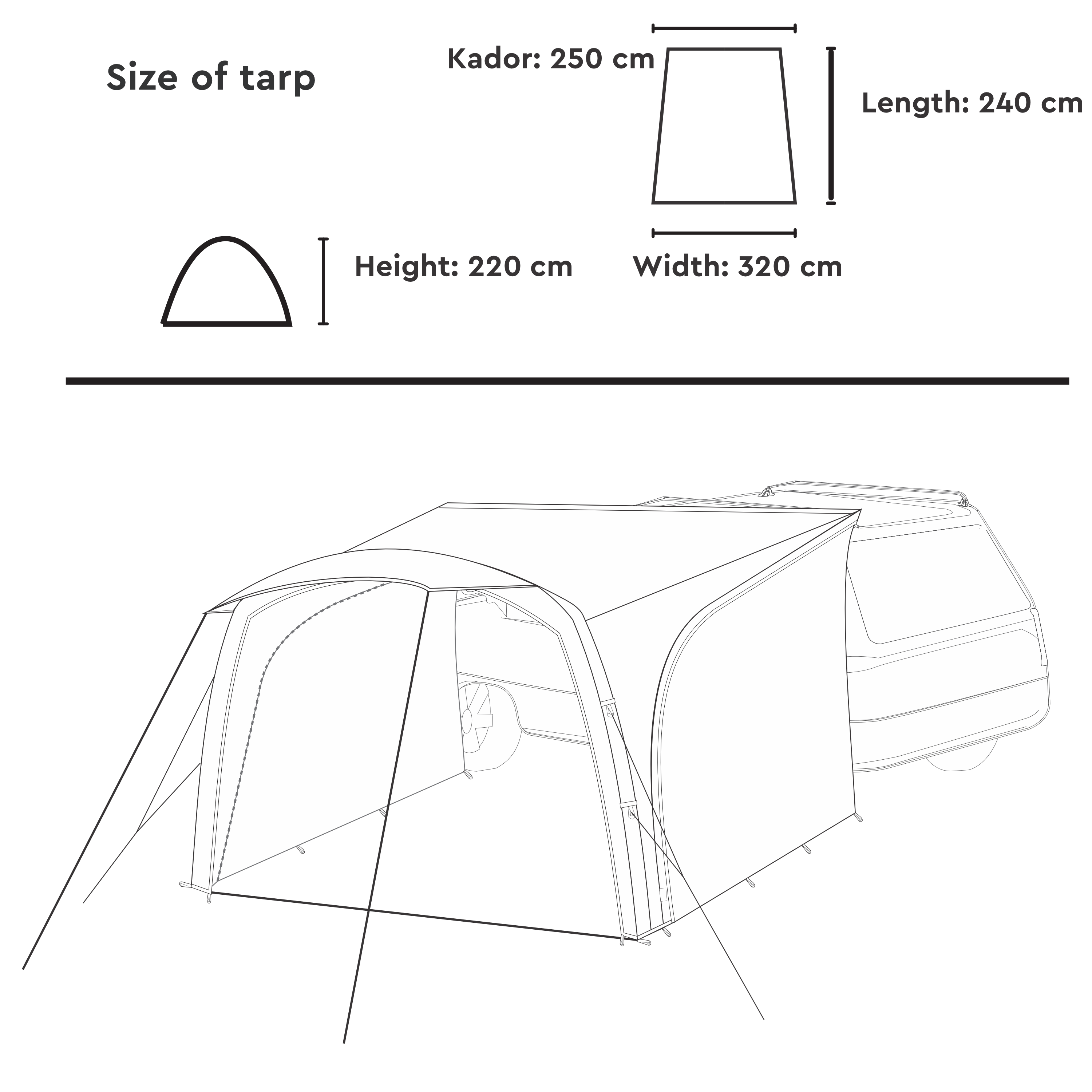 Koon ollessa noin 320 × 240 × 220 cm (P × L × K) syntyy tilava ja varjoisa alue istumiseen, ruoanlaittoon tai rentoutumiseen. Aurinkokatos sopii ajoneuvoihin, joiden kiinnityskorkeus on noin 180–210 cm, ja se on helposti sovitettavissa useimpiin retkeilyautoihin ja -vaneihin. Etuosa on tarkoituksella avoin, mikä luo ilmavan tilantunteen, kun taas sivupaneelit voidaan tarvittaessa sulkea tuuli- ja näkösuojaksi. Musta pinnoite vähentää suoraa auringonpaistetta merkittävästi ja parantaa mukavuutta kuumina päivinä.