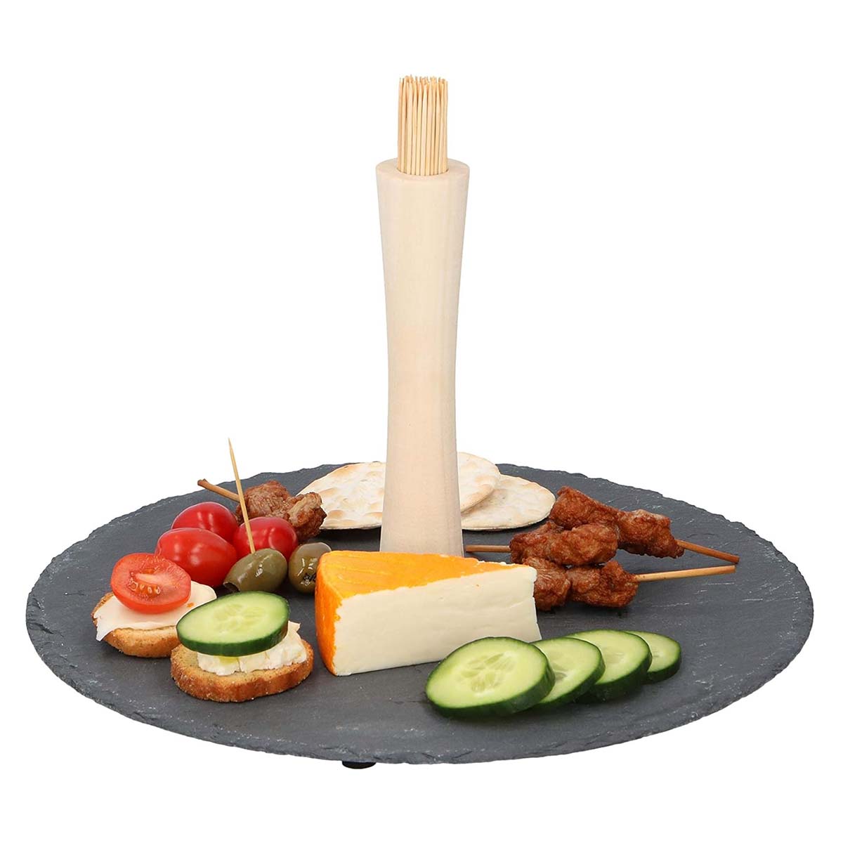 Tässä Alpinan aperitiivisarjassa yhdistyvät luonnollinen eleganssi ja käytännöllisyys. Se koostuu suuresta 30 cm:n liuskekivitarjottimesta, keskimmäisestä puukahvasta ja 100:sta bambutikusta, ja se on ihanteellinen tapasten, alkupalojen tai juustojen tarjoiluun. Helppo käyttää ja puhdistaa, tämä jalusta tuo kulinaariset luomuksesi esille aperitiivien yhteydessä ystävien tai perheen kanssa.