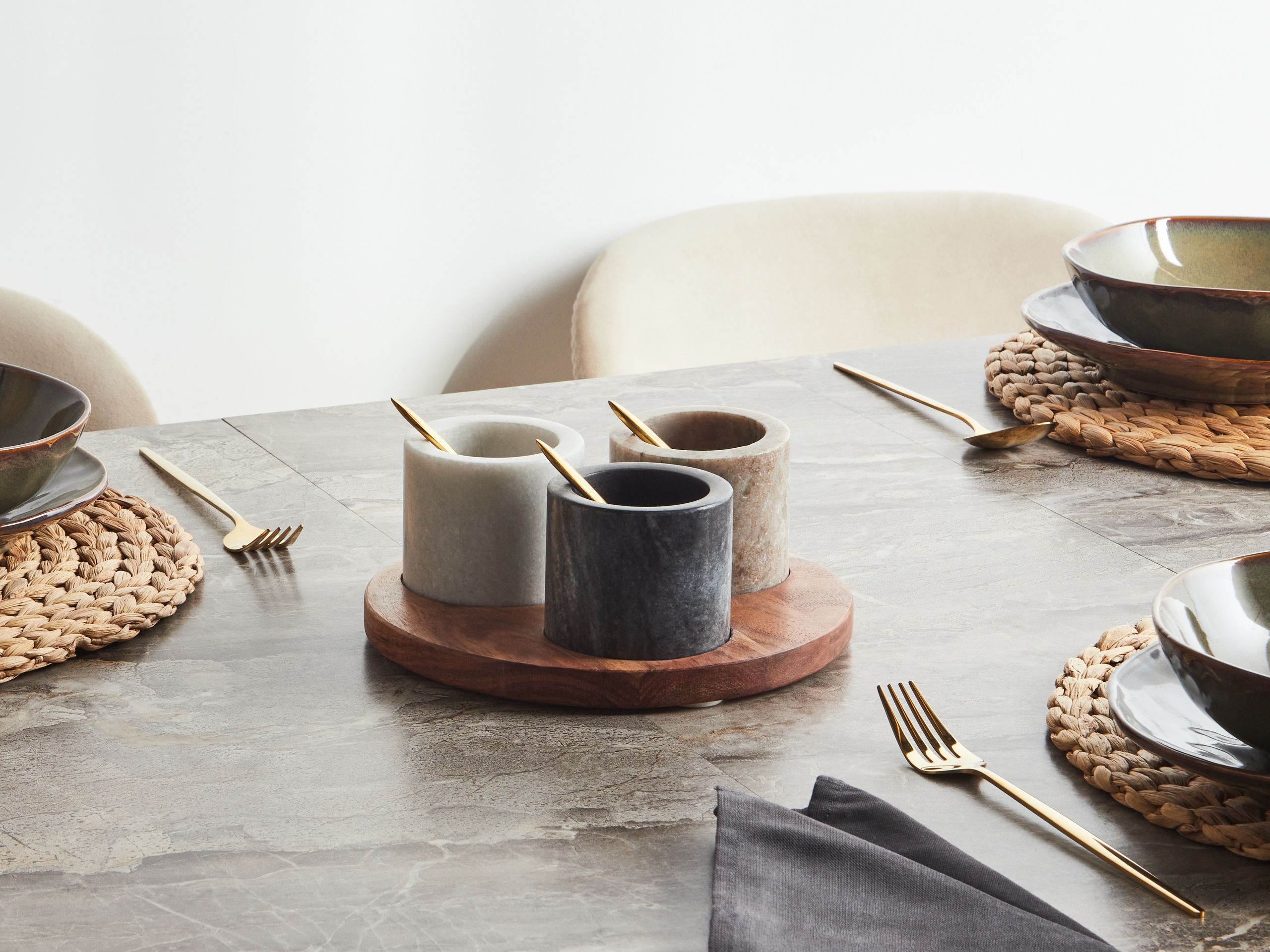 Kolmen astian pyöreä tarjotin. Tämä tarjoiluastia on täydellinen lisä ruokailutilaan. Koristeelliset mutta samalla käytännölliset kulhot on valmistettu tyylikkäästä marmorista ja sijoitettu kestävälle akasiapuiselle alustalle. Tarjotinta on helppo liikutella, ja se toimii jokapäiväisessä käytössä esimerkiksi dippien tarjoiluun tai mausteiden säilömiseen. Muotoilunsa ansiosta se on tilaa säästävä ja tyylikäs lisä jokaiseen keittiöön.