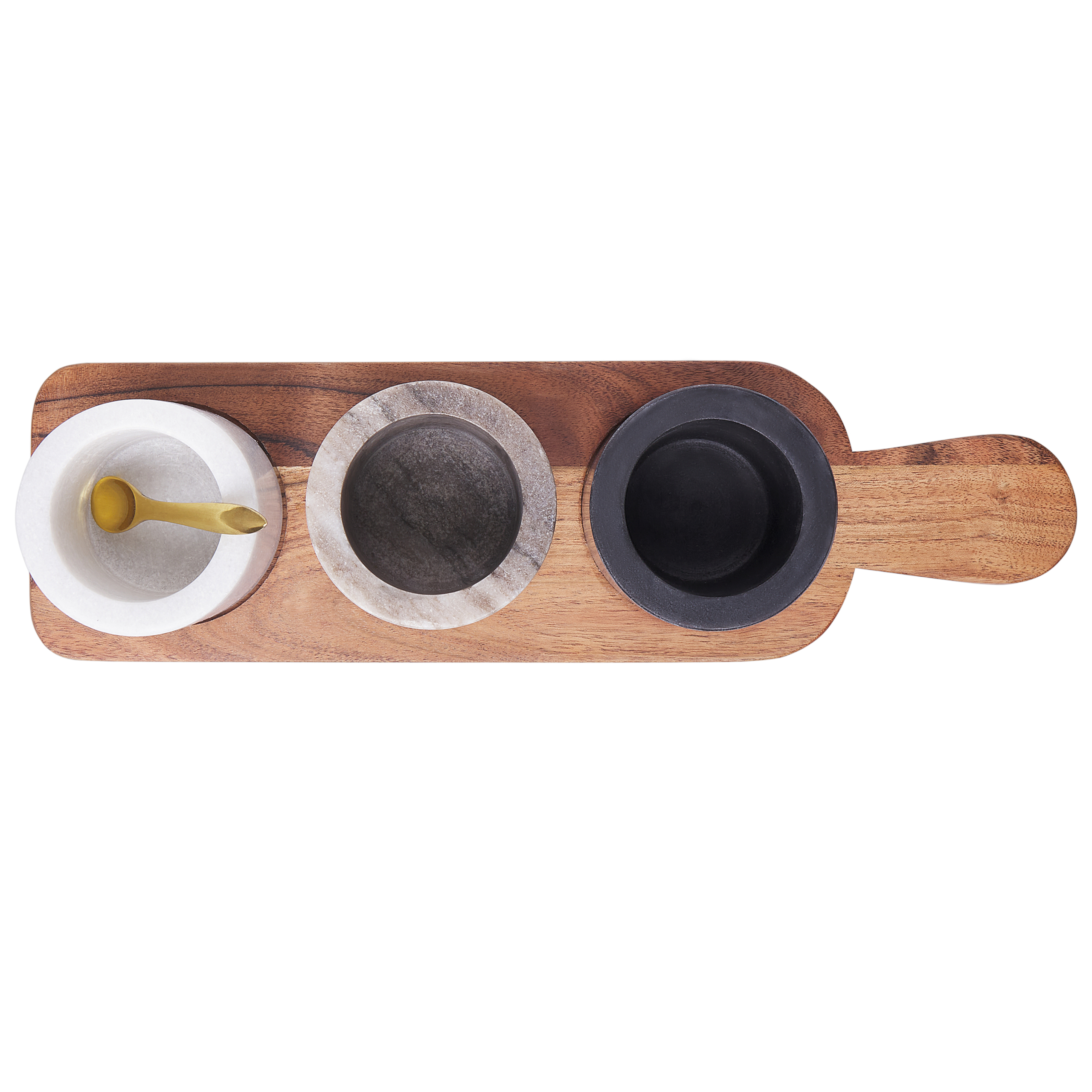 Kolmen astian puutarjotin. Tämä tarjoiluastia on täydellinen lisä ruokailutilaan. Koristeelliset mutta samalla käytännölliset kulhot on valmistettu tyylikkäästä marmorista ja sijoitettu kestävälle akaasiapuualustalle. Tarjotinta on helppo liikutella ja se toimii jokapäiväisessä käytössä esimerkiksi dippien tarjoiluun tai mausteiden säilömiseen. Muotoilunsa ansiosta se on tilaa säästävä ja tyylikäs lisä jokaiseen keittiöön.