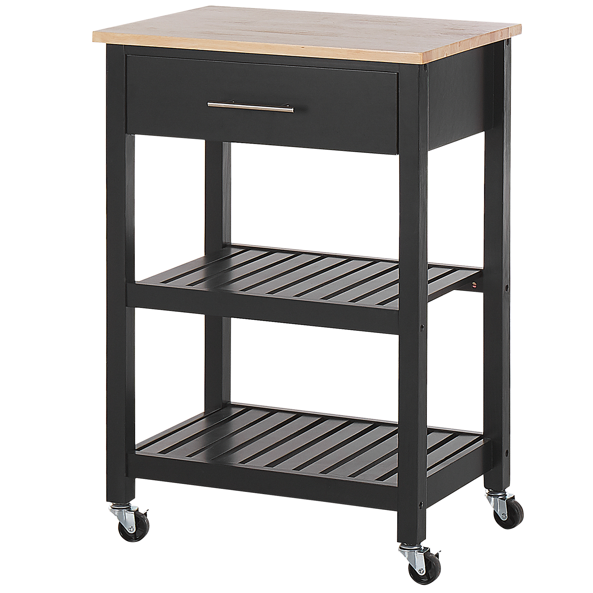 Rustiikkinen kolmitasoinen keittiövaunu. Käytännöllisyyttä ja minimalistista muotoilua yhdistelevä tarjoiluvaunu sopii loistavasti mihin tahansa tilaan, tarjoten lisätasoa ja säilytystilaa. Vaalea pöytälevy on valmistettu kumipuusta, kun taas runko on kestävää MDF-levyä ja jalat mäntyä. Neljän pyörän avulla keittiövaunua on helppo siirtää paikasta toiseen ja kompaktin koko saa sen sopimaan pienempiinkin tiloihin. Aseta pannut, hedelmät tai astiastot esille avoimille hyllyille ja piilota tarpeelliset esineet laatikkoon. Kaunis väriyhdistelmä täydentää vaunun ilmettä ja saa sen sopimaan sisutukseen kuin sisustukseen.