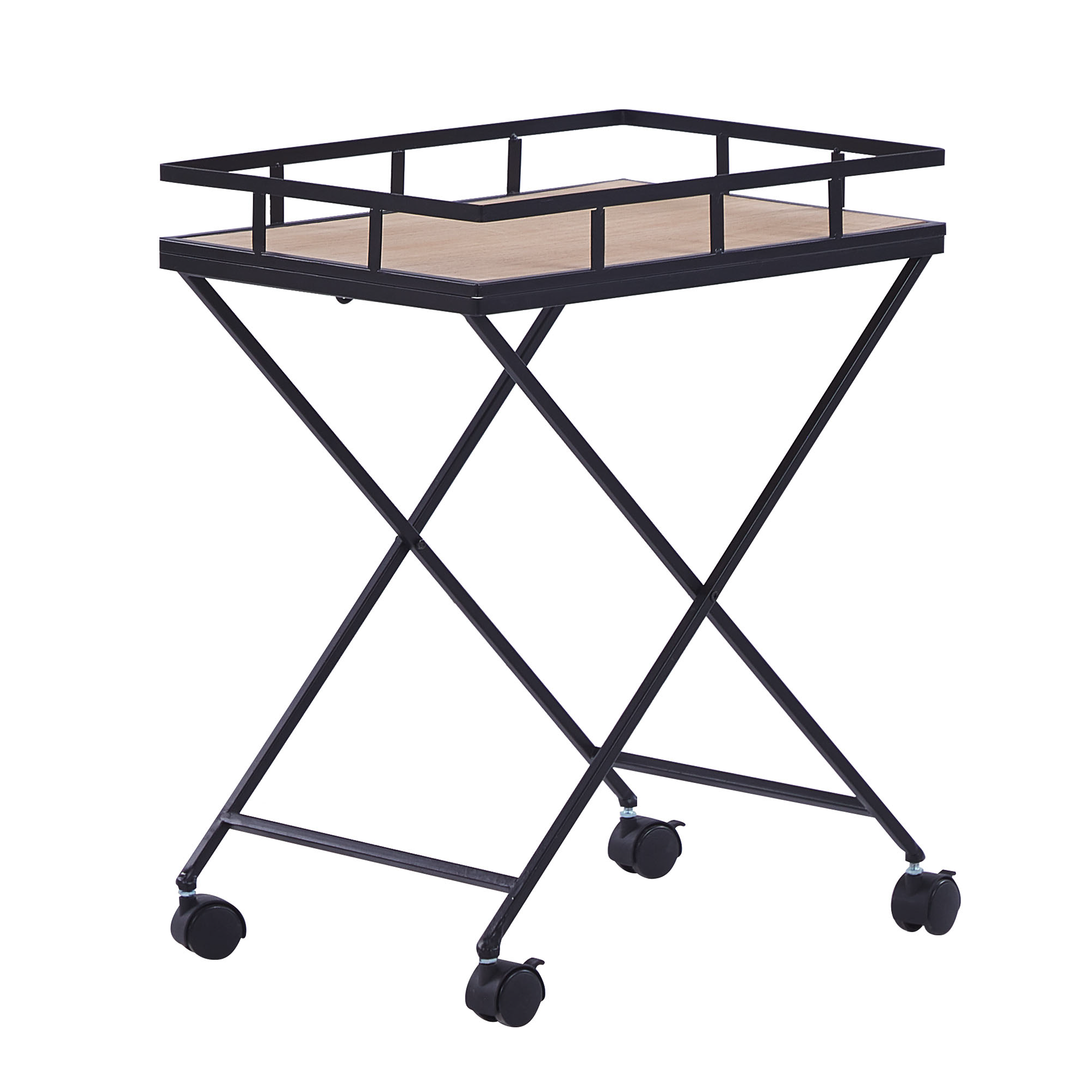 Industriaalinen keittiövaunu. Tarjoile tyylillä. Tämän pyörillä varustetun tarjoiluvaunun avulla saat helposti tuotua kaikki naposteltavat tai juomat keittiöstä mihin tahansa tilaan vieraillesi. Vaunun yläosa on valmistettu MDF-levystä puumaisella viimeistelyllä ja se on helposti irrotettavissa jolloin siitä saa tarjottimen. Vaunua voi käyttää myös sivupöytänä, sillä siinä on hyvin tilaa koriste-esineille tai lempikukillesi. Kestävä metallirunko antaa tuotteelle teollisen ilmeen, mikä sopii useaan sisustukseen.