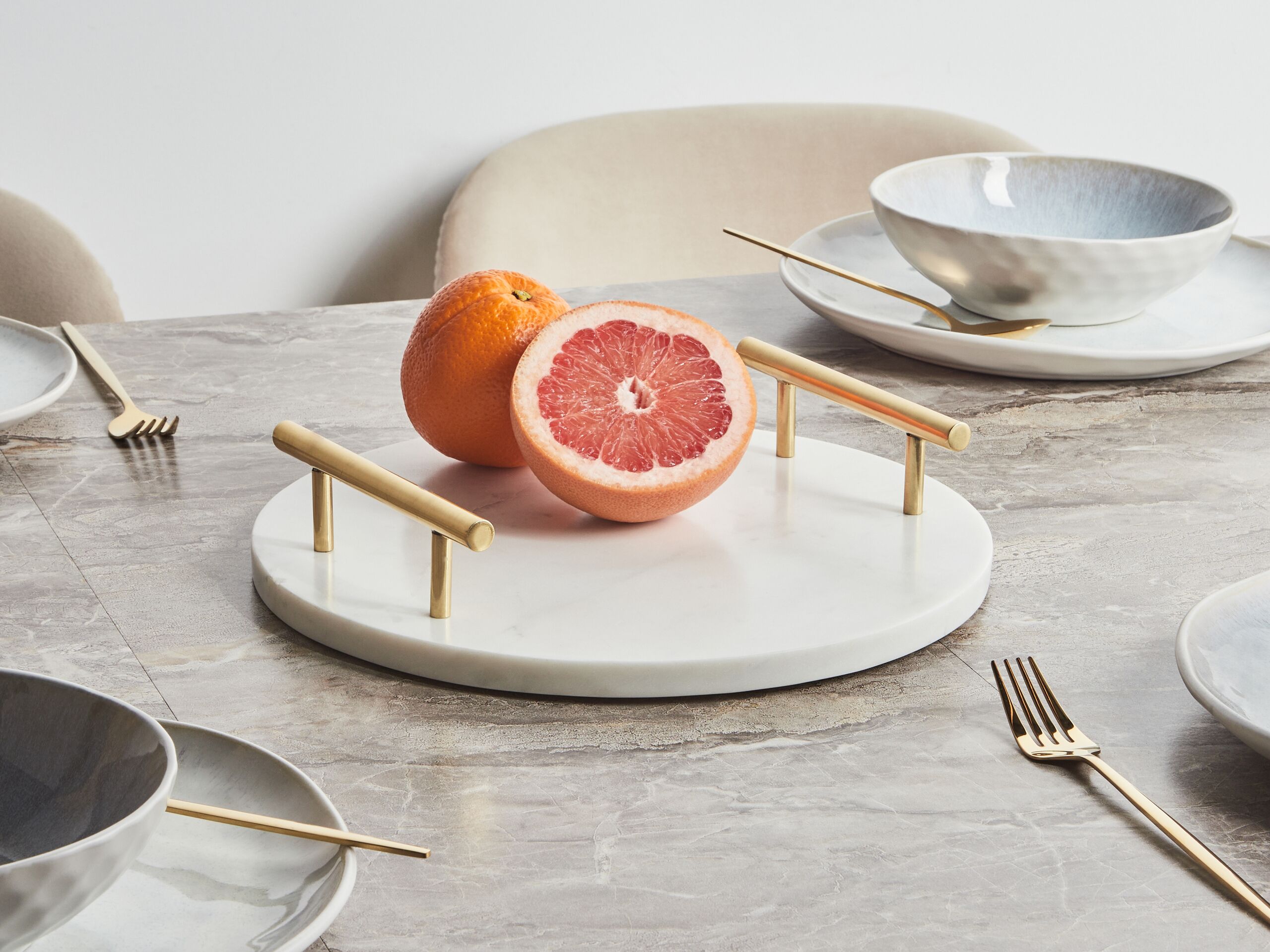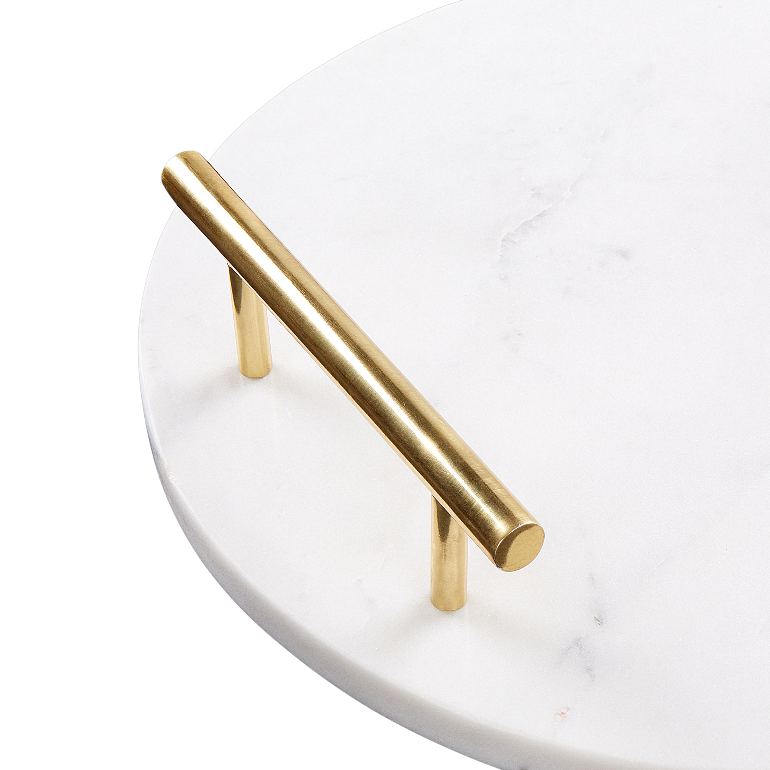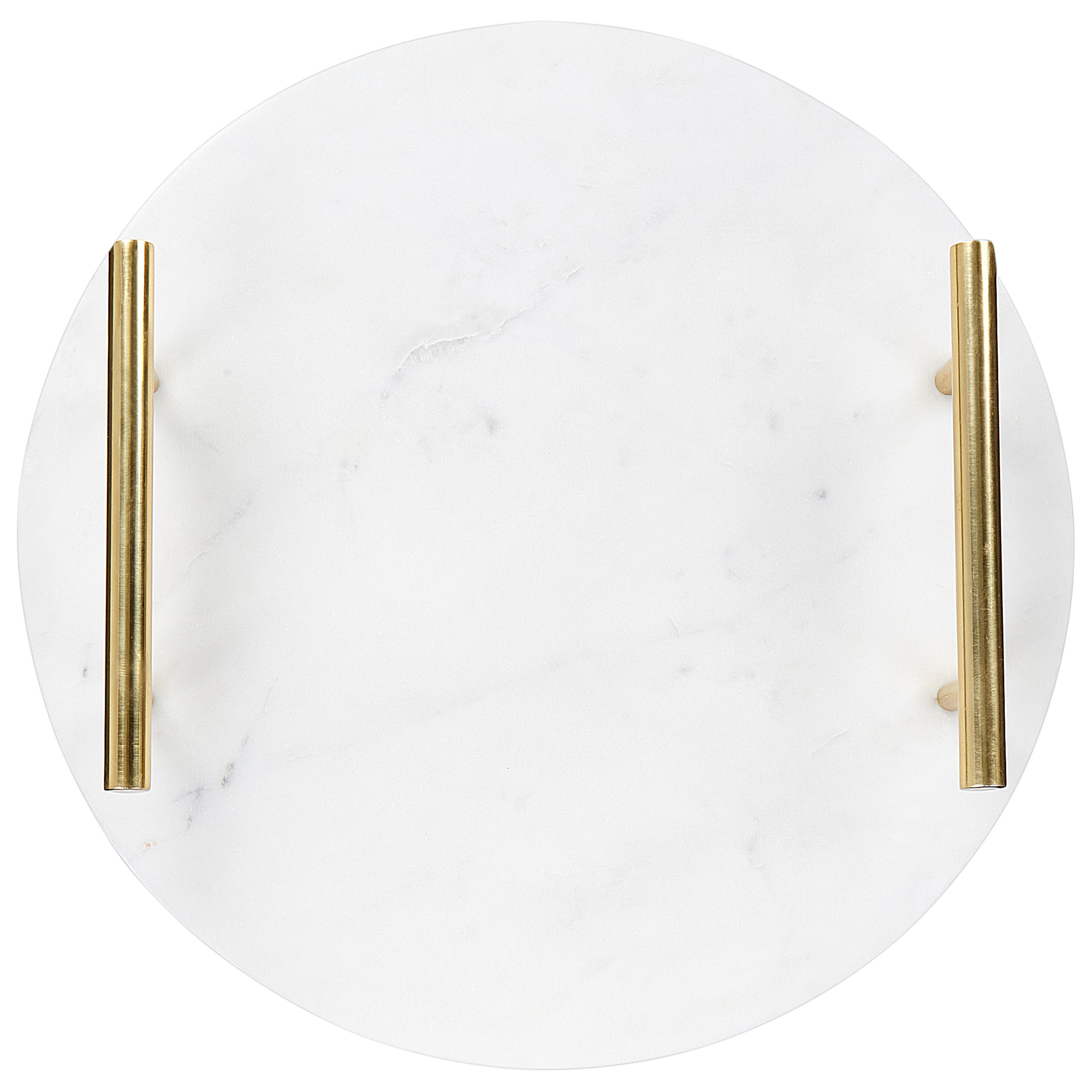 Pyöreä marmoritarjotin kahvoilla. Valkoisesta marmorista valmistettu pyöreä tarjotin, jossa on kultaiset kahvat, on tyylikäs tapa tarjoilla herkkuja tai esitellä koristeita. Jokainen tarjotin on valmistettu käsityönä korkealaatuisesta marmorista, jossa on luonnollisia kuvioita, mikä tekee siitä uniikin. Tarjottimessa on tyylikkäät kultaiset kahvat, jotka helpottavat kantamista. Sileä, kiillotettu pinta lisää hienostuneisuutta mihin tahansa tilaan ja sisustukseen.
