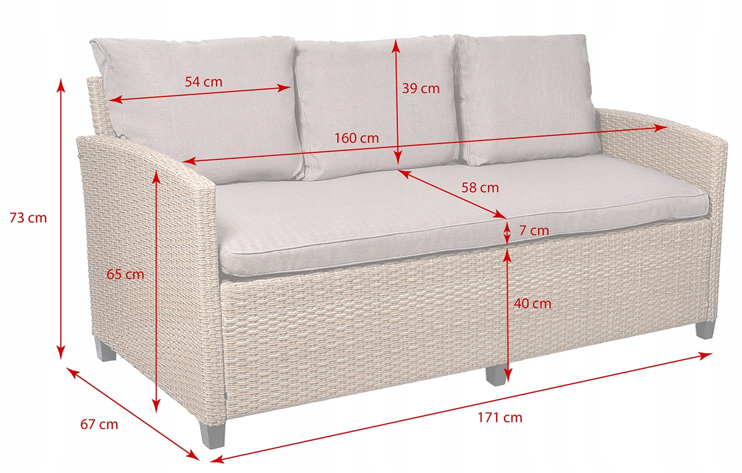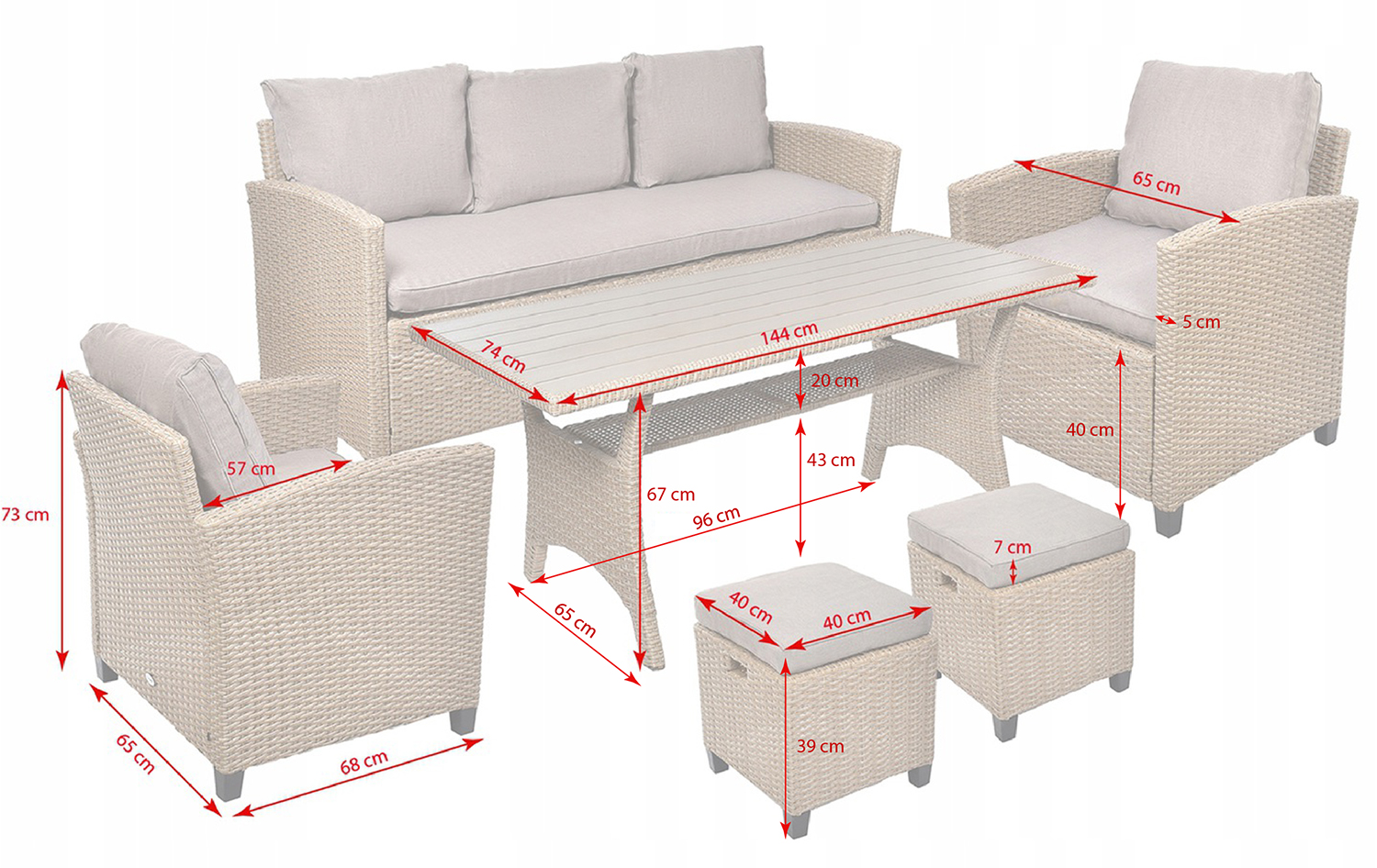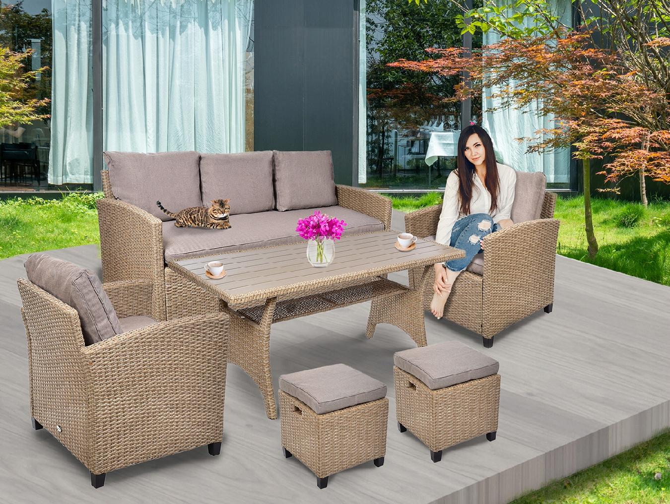 Toiminnalliset puutarhakalusteet MILANO seitsemälle hengelle tarkoitettu setti sisältää kolmen istuttavan sohvan, kaksi nojatuolia, kaksi rahia ja suorakaiteen muotoisen pöydän. Tämä teknorottinkinen puutarhakalustesetti näyttää tyylikkäältä, ja leveät istuimet tyynyineen lisäävät mukavuutta. Huonekalujen yksinkertaisen ja klassisen muodon ansiosta ne sopivat helposti mihin tahansa puutarhajärjestelyyn. Väri: beige
