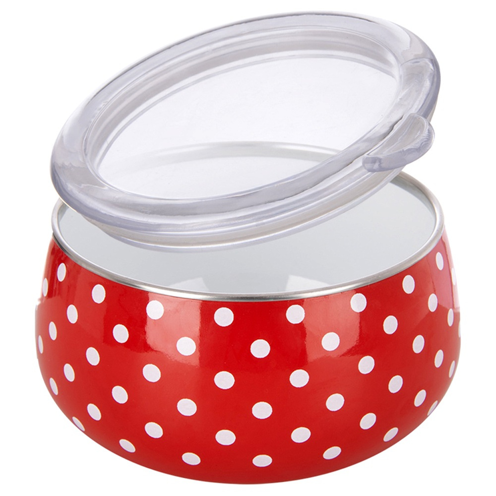 Valmistettu emaloidusta teräksestä - Valmistettu korkealaatuisesta punaisesta emaloidusta teräksestä. Siinä on silmiinpistävä koriste valkoisten pilkkujen muodossa pinnalla. Kulhon sisäpuoli on valkoinen. Kulhon reuna on valmistettu hopeanvärisestä ruostumattomasta teräksestä. Kansi on valmistettu läpinäkyvästä muovista. Emalipinnoite on terveysystävällinen ja turvallinen jopa allergikoille.