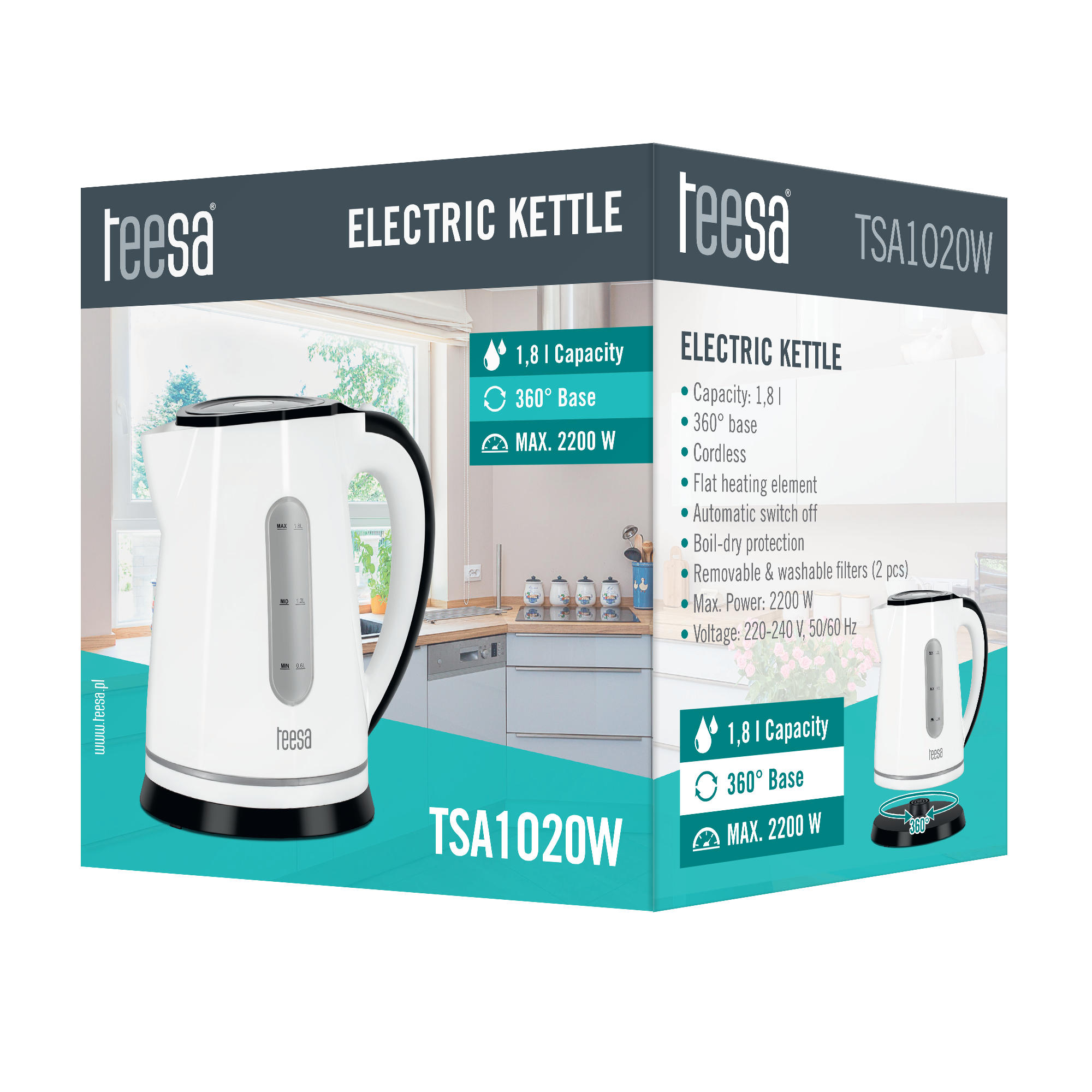Teesa-vedenkeittimen (TSA1020) korkealaatuinen materiaali ja saatavuus valkoisena tai mustana tekevät laitteesta täydellisen valinnan lähes mihin tahansa keittiön sisustukseen. Suuri tilavuus – 1,8 l ja maksimiteho 2200 W mahdollistavat suurten vesimäärien nopean kiehauttamisen, kun taas erittäin hiljainen lämmityselementti varmistaa lähes äänettömän toiminnan. Tuotteessa on kääntyvä jalusta, joka takaa mukavan käytön sekä oikea- että vasenkätisille. Automaattinen virrankatkaisu ja kuivakäynnistyssuoja takaavat turvallisen käytön, ja taustavalo käytön aikana.
