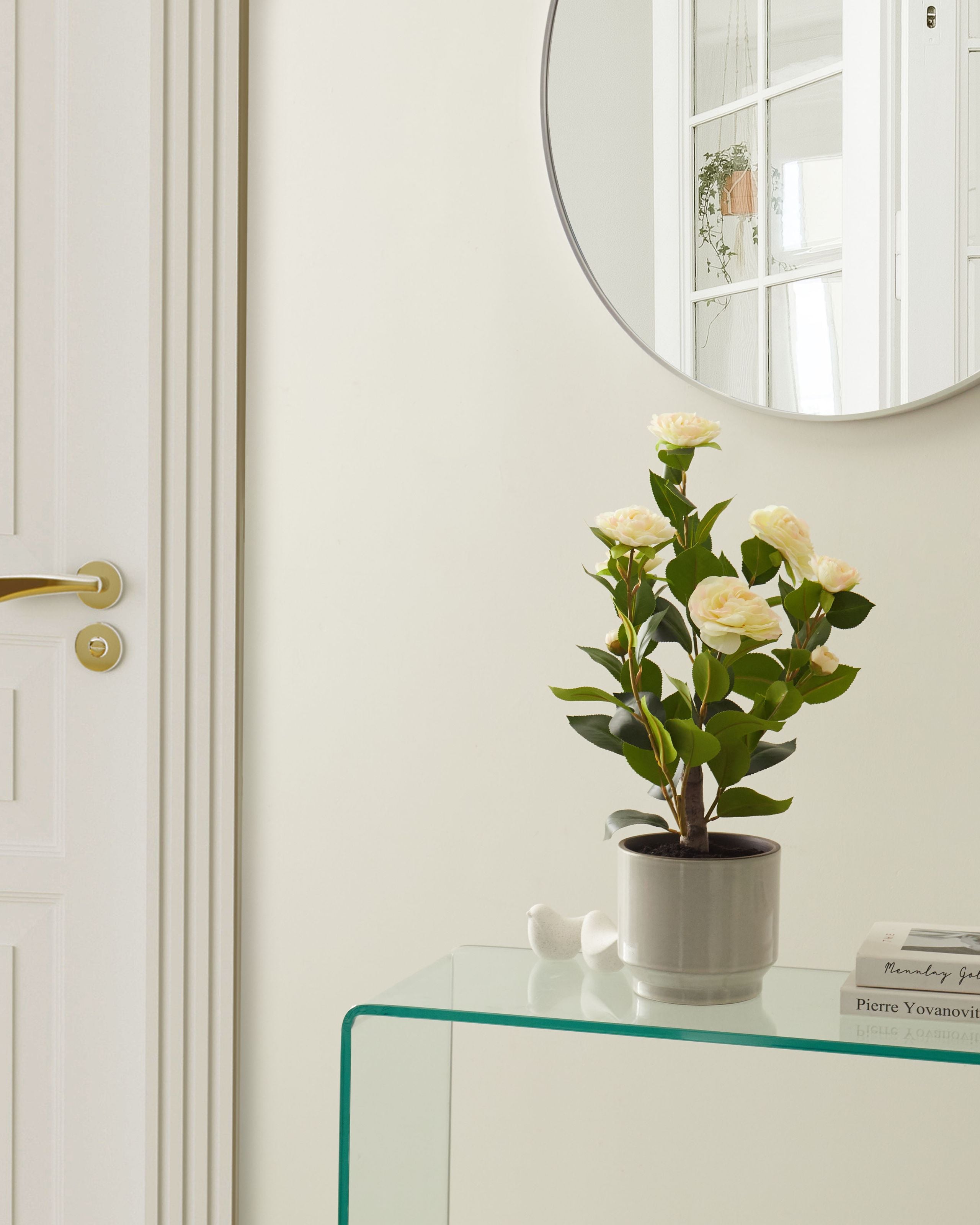 Keinotekoinen kamelia ruukussa. Tämä keinotekoinen kamelia tuo eleganssia ja väriä mihin tahansa tilaan. Herkät, aidonnäköiset kukat ja rehevät vihreät lehdet tekevät siitä kauniin ilman huolta ylläpidosta. Se sopii erinomaisesti piristämään hyllyjä, pöytiä tai ikkunalautoja sekä kotona että toimistossa.