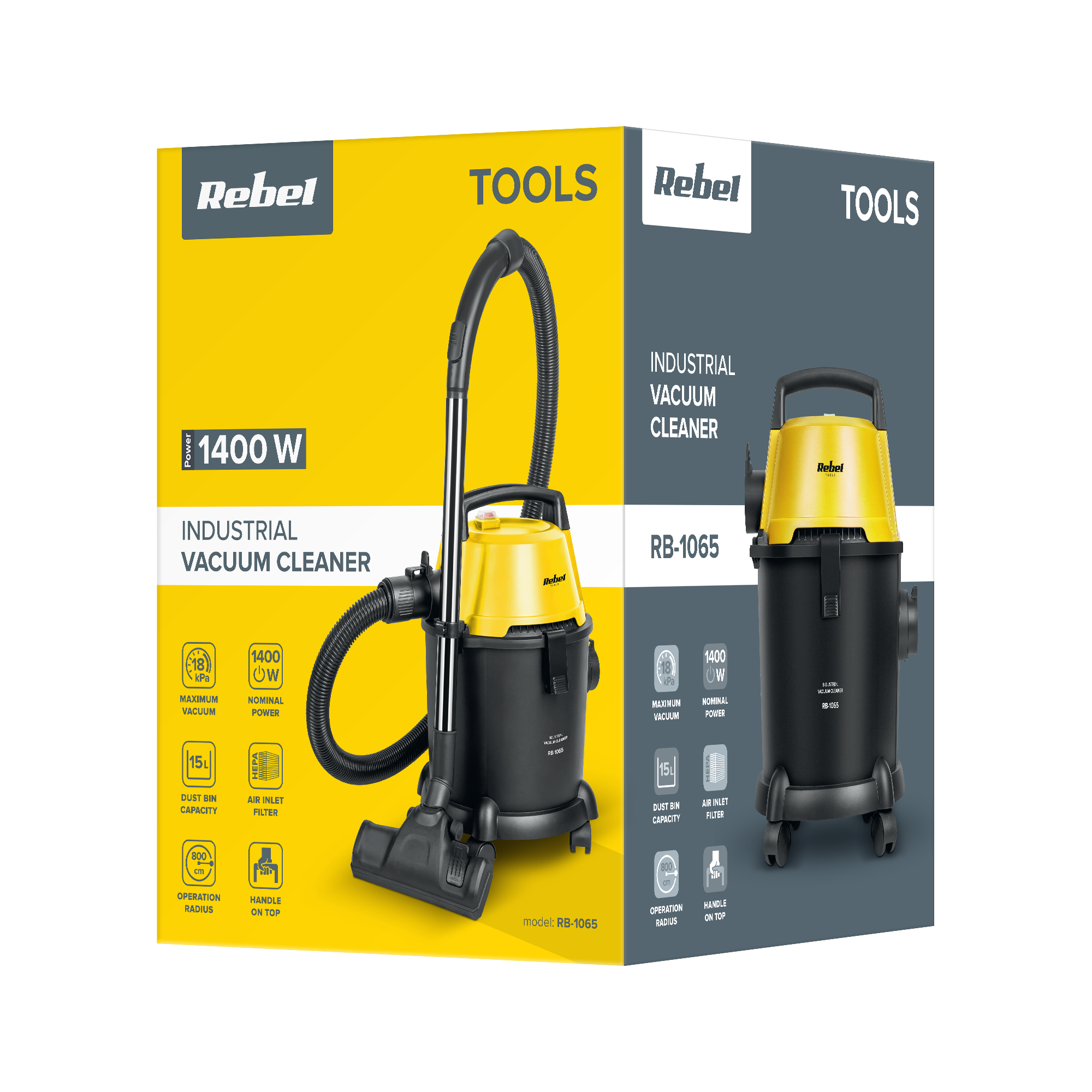 Rebel-teollisuuspölynimurissa on suuri, 15 litran pölysäiliö, joka mahdollistaa pitkän käyttöiän ilman tyhjennystä. Toinen kohokohta on yleiskäyttöinen HEPA-suodatin, joka sopii sekä kuivalle että märälle lialle. Pölynimurissa on neljä vaihdettavaa lisäosaa, joiden avulla voit poistaa likaa erilaisilta pinnoilta ja vaikeasti tavoitettavista paikoista.