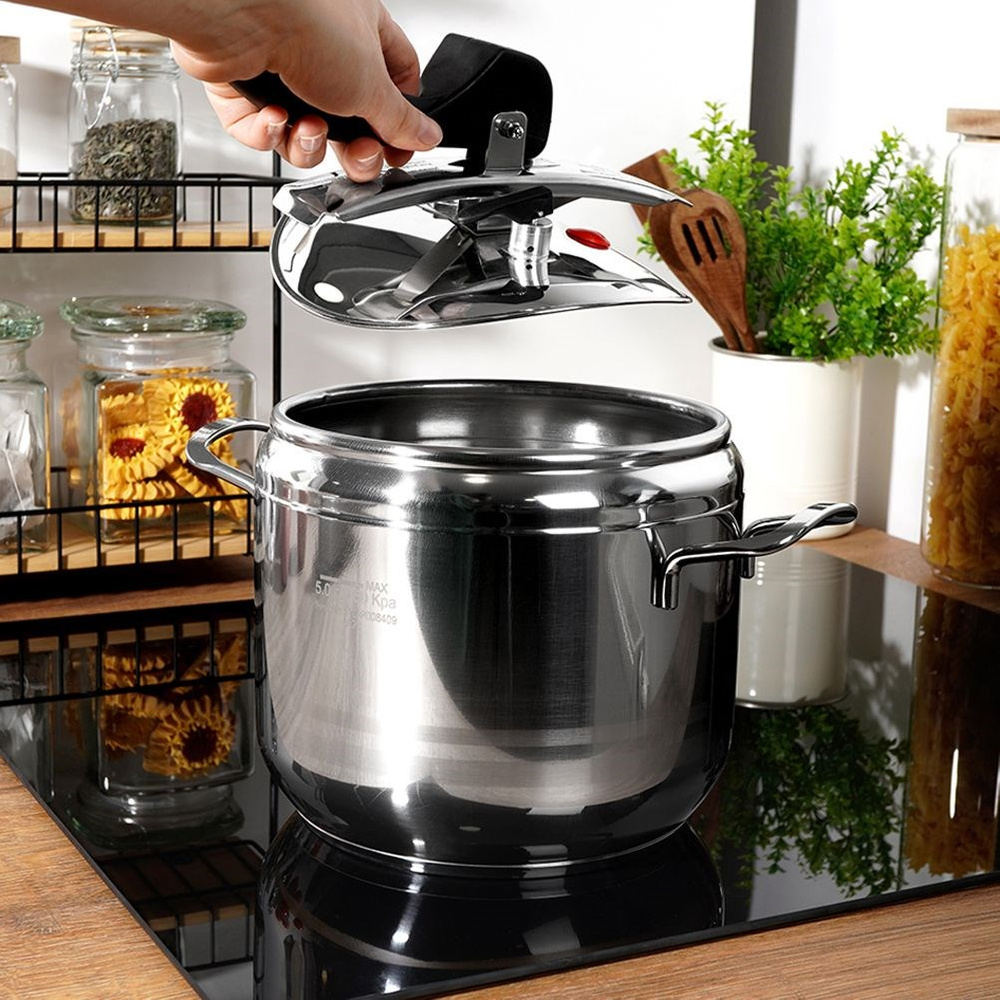 LUOTETTAVA - Painekattila on erityinen kattila, jossa kypsennetään korkeassa paineessa. Kokonaistilavuus on 5 litraa. Kattilan korkeus kannen kanssa on 23,5 cm ja ilman kantta 17 cm.