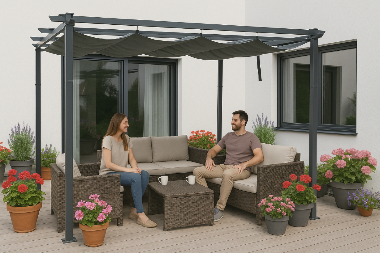 Pergola, jossa on sisäänvedettävä katto, on elegantti ja toimiva ratkaisu kaikille, jotka arvostavat mukavaa lepoa raikkaassa ilmassa. Tämä on täydellinen tila perhejuhliin, grillijuhliin ystävien kanssa tai hiljaiseen hetkeen kirjan parissa.