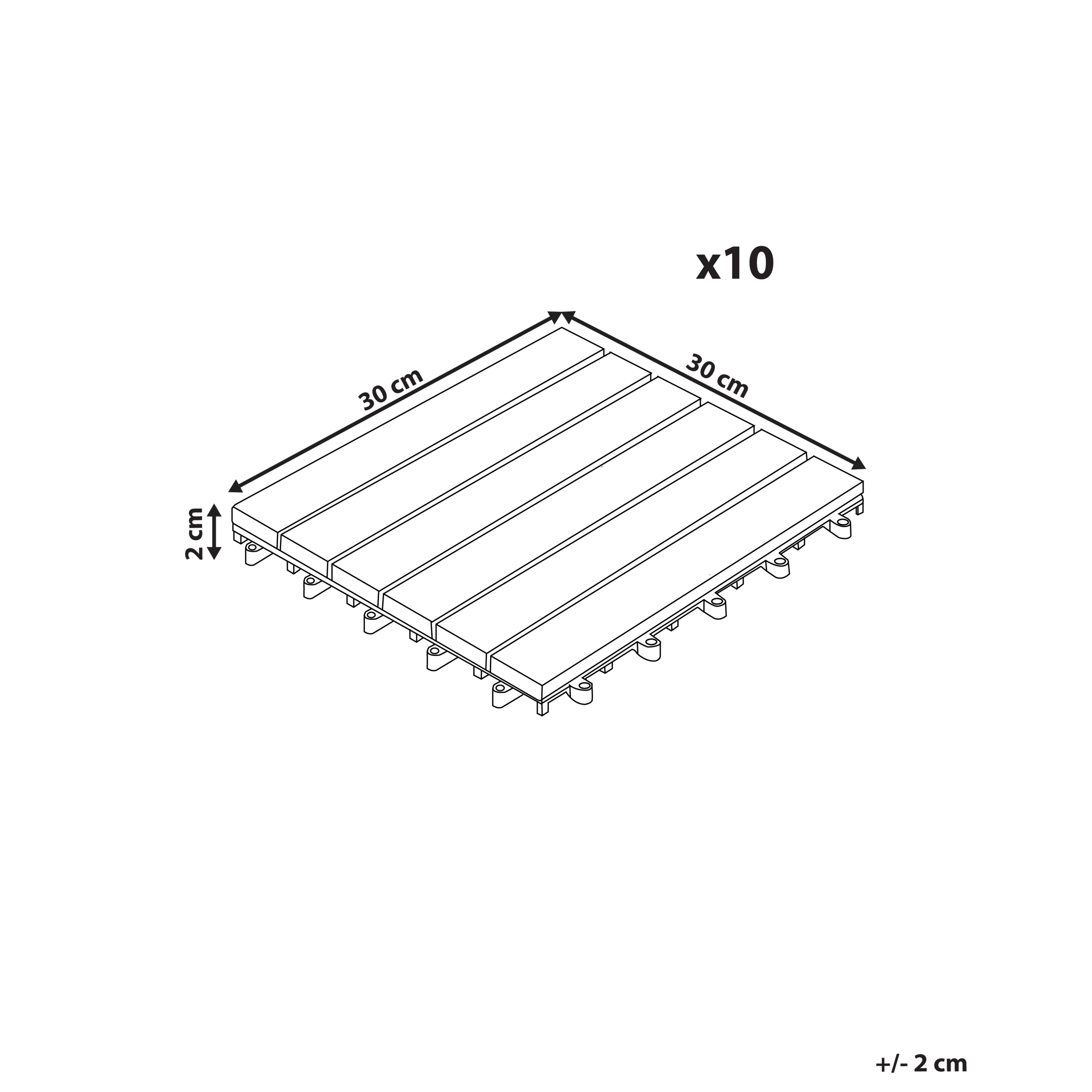 Lisätiedot: Välttääksesi terassilaattojen mahdollisen vaurioitumisen tai vääntymisen ajan myötä, varmista ennen asennusta, että pinta on puhdas, tasainen ja kuiva. Huomaathan, että tuote on valmistettu puusta, joka voi kaikenlaisille sääolosuhteille altistuessaan haalistua tai värjäytyä ajan myötä.