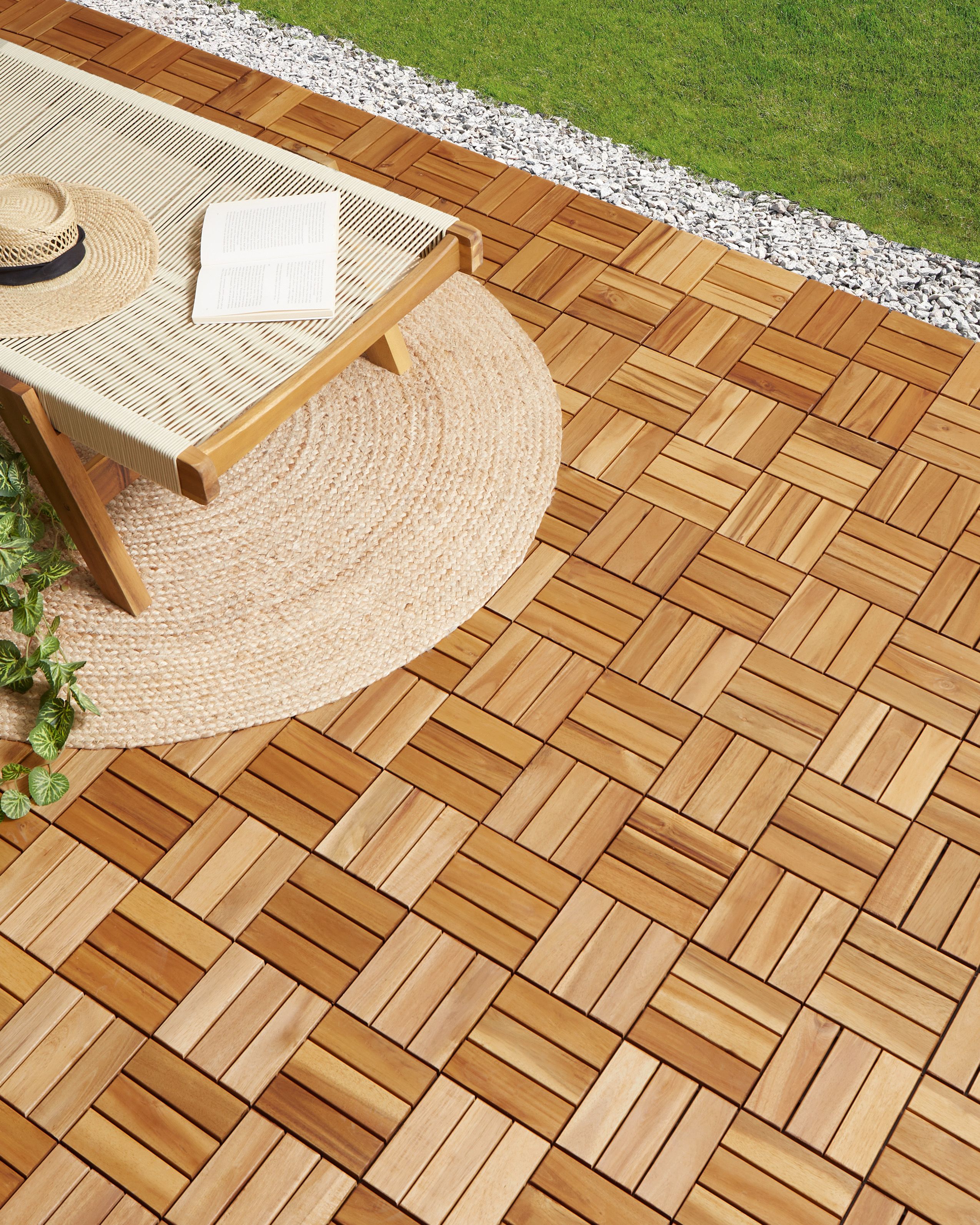 Yhteen napsautettavat lattialaatat ulkokäyttöön. Päivitä ulkotilasi ilmettä tämän monipuolisen terassilaattasetin avulla. Ne ovat helppoja asentaa, sillä lattiaritilät vain napsautetaan yhteen. Lisäksi voit järjestää ne vaivattomasti uudelleen niin, että ne sopivat tilaan täydellisesti. Sertifioidusta akasiapuusta valmistetut ja tukevalla muovitaustalla täydennetyt laatat ovat säänkestäviä ja takaavat pitkäikäisen kestävyyden. Neutraali sävy täydentää vaivattomasti erityylisiä terasseja ja parvekkeita.