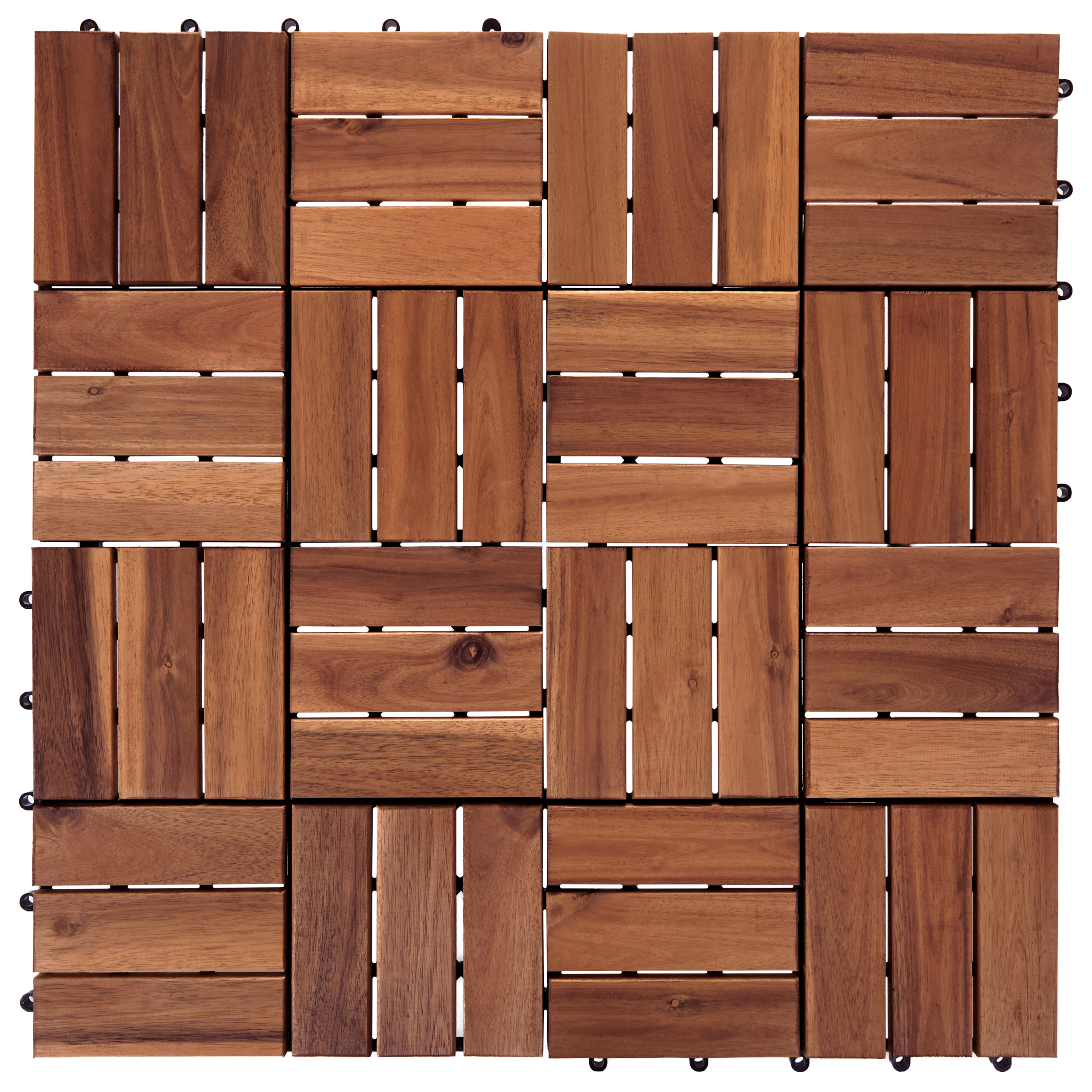 Yhteen napsautettavat lattialaatat ulkokäyttöön. Päivitä ulkotilasi ilmettä tämän monipuolisen terassilaattasetin avulla. Ne ovat helppoja asentaa, sillä lattiaritilät vain napsautetaan yhteen. Lisäksi voit järjestää ne vaivattomasti uudelleen niin, että ne sopivat tilaan täydellisesti. Sertifioidusta akasiapuusta valmistetut ja tukevalla muovitaustalla täydennetyt laatat ovat säänkestäviä ja takaavat pitkäikäisen kestävyyden. Neutraali sävy täydentää vaivattomasti erityylisiä terasseja ja parvekkeita.