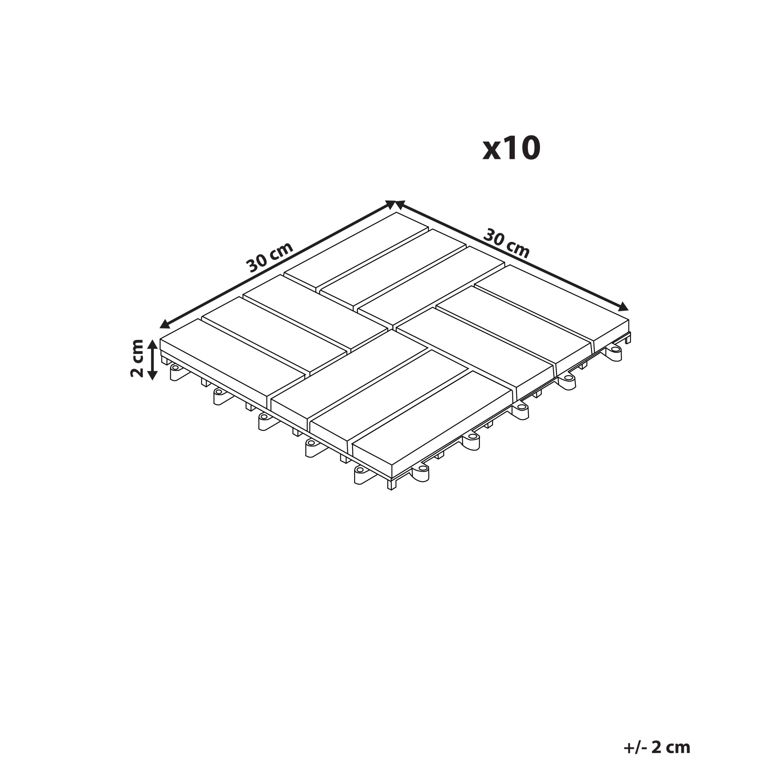Lisätiedot: Välttääksesi terassilaattojen mahdollisen vaurioitumisen tai vääntymisen ajan myötä, varmista ennen asennusta, että pinta on puhdas, tasainen ja kuiva. Huomaathan, että tuote on valmistettu puusta, joka voi kaikenlaisille sääolosuhteille altistuessaan haalistua tai värjäytyä ajan myötä.