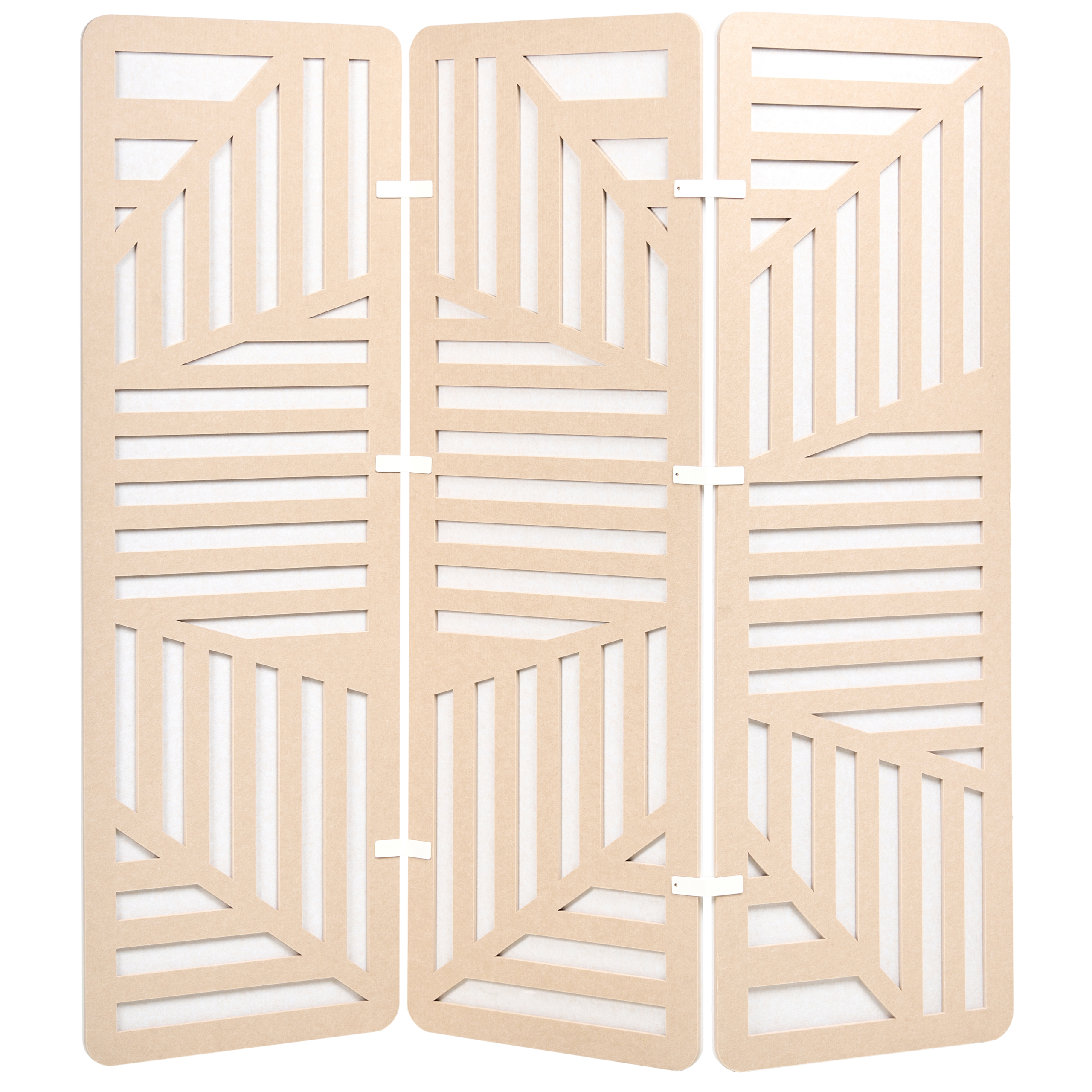 Moderni kuvioitu kokoontaitettava sermi. Lisää työtilaan ripaus modernia tyyliä tällä tyylikkäällä 3-paneelisella tilanjakajalla. Sen selkeät linjat ja geometriset kuviot tarjoavat sekä yksityisyyttä että visuaalista vetovoimaa, mikä tekee siitä täydellisen henkilökohtaisen tilan luomiseen jaetuissa tiloissa. Kevyt ja kokoontaitettava rakenne helpottaa siirtämistä ja uudelleenjärjestelyä tarpeen mukaan.