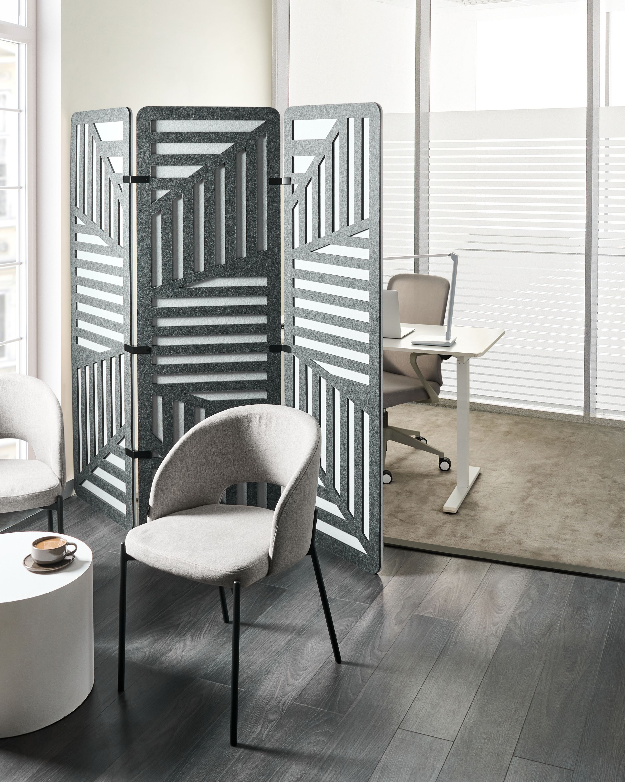 Moderni kuvioitu kokoontaitettava sermi. Lisää työtilaan ripaus modernia tyyliä tällä tyylikkäällä 3-paneelisella tilanjakajalla. Sen selkeät linjat ja geometriset kuviot tarjoavat sekä yksityisyyttä että visuaalista vetovoimaa, mikä tekee siitä täydellisen henkilökohtaisen tilan luomiseen jaetuissa tiloissa. Kevyt ja kokoontaitettava rakenne helpottaa siirtämistä ja uudelleenjärjestelyä tarpeen mukaan.