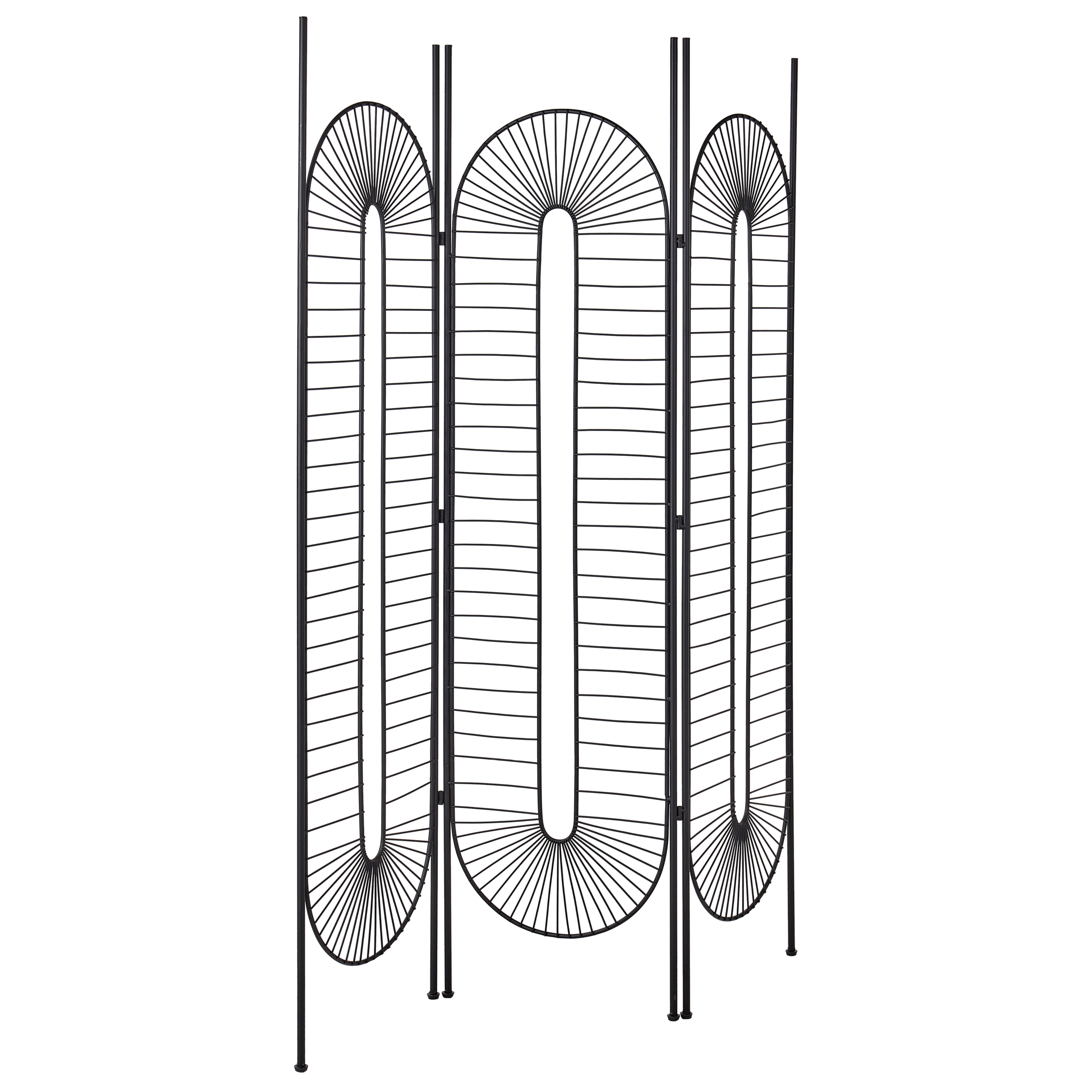 Käsintehty kokoontaitettava sermi. Kohota mitä tahansa tilaa ja erota alueet toisistaan tällä tyylikkäällä tilanjakajalla, joka on valmistettu käsin kestävästä ja helposti puhdistettavasta raudasta. Sen kolmea kauniisti kaarevaa paneelia koristaa kiehtova geometrinen kuviointi, ja musta väri tarjoaa ripauksen eleganssia, joka sopii täydellisesti moderniin tai glamour-tyyliseen sisustukseen. Kokoontaitettava ominaisuus mahdollistaa helpon säilytyksen.
