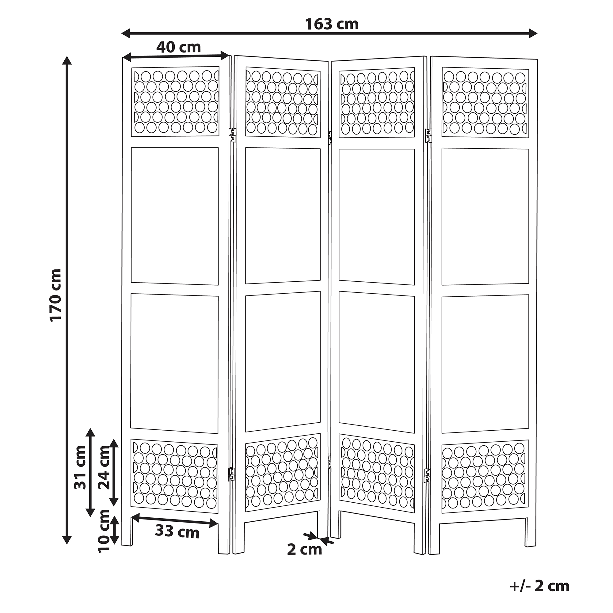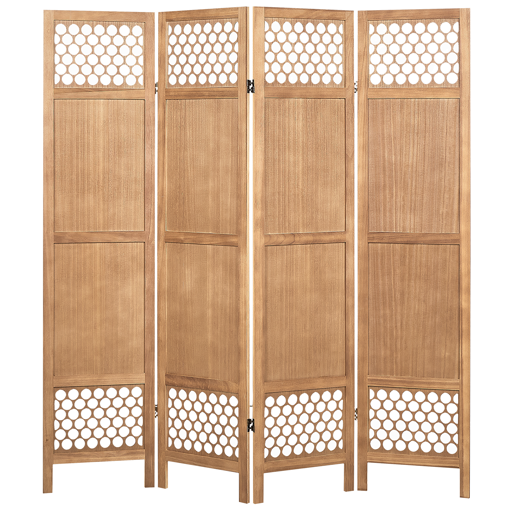 Moderni kokoontaitettava sermi. Tuo ripaus hienostuneisuutta osaksi sisustustasi tällä 4-paneelisella huoneenjakajalla, joka yhdistää perinteisen charmin moderniin tyyliin. Kestävästä keisaripuusta ja MDF-levystä valmistettu huoneenjakaja tarjoaa sekä eleganssia että kestävyyttä, täydentäen esteettistä tyyliäsi vaivattomasti. Kokoontaitettavat paneelit helpottavat säilytystä ja päivittäistä ylläpitoa.