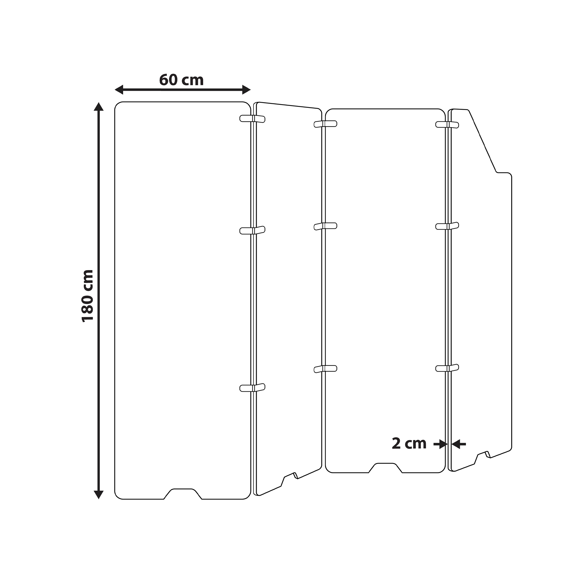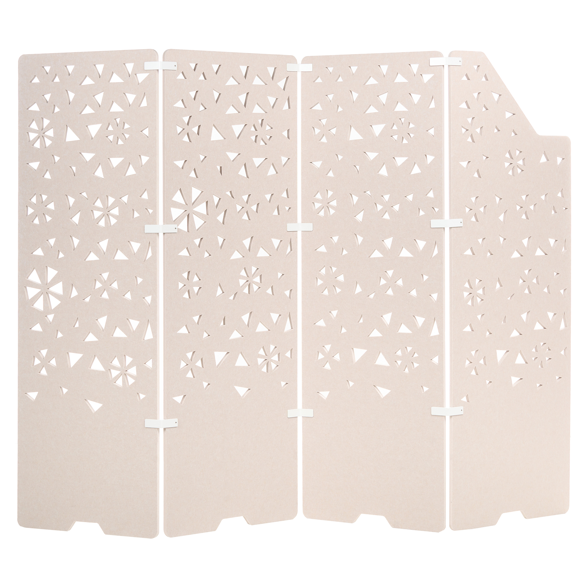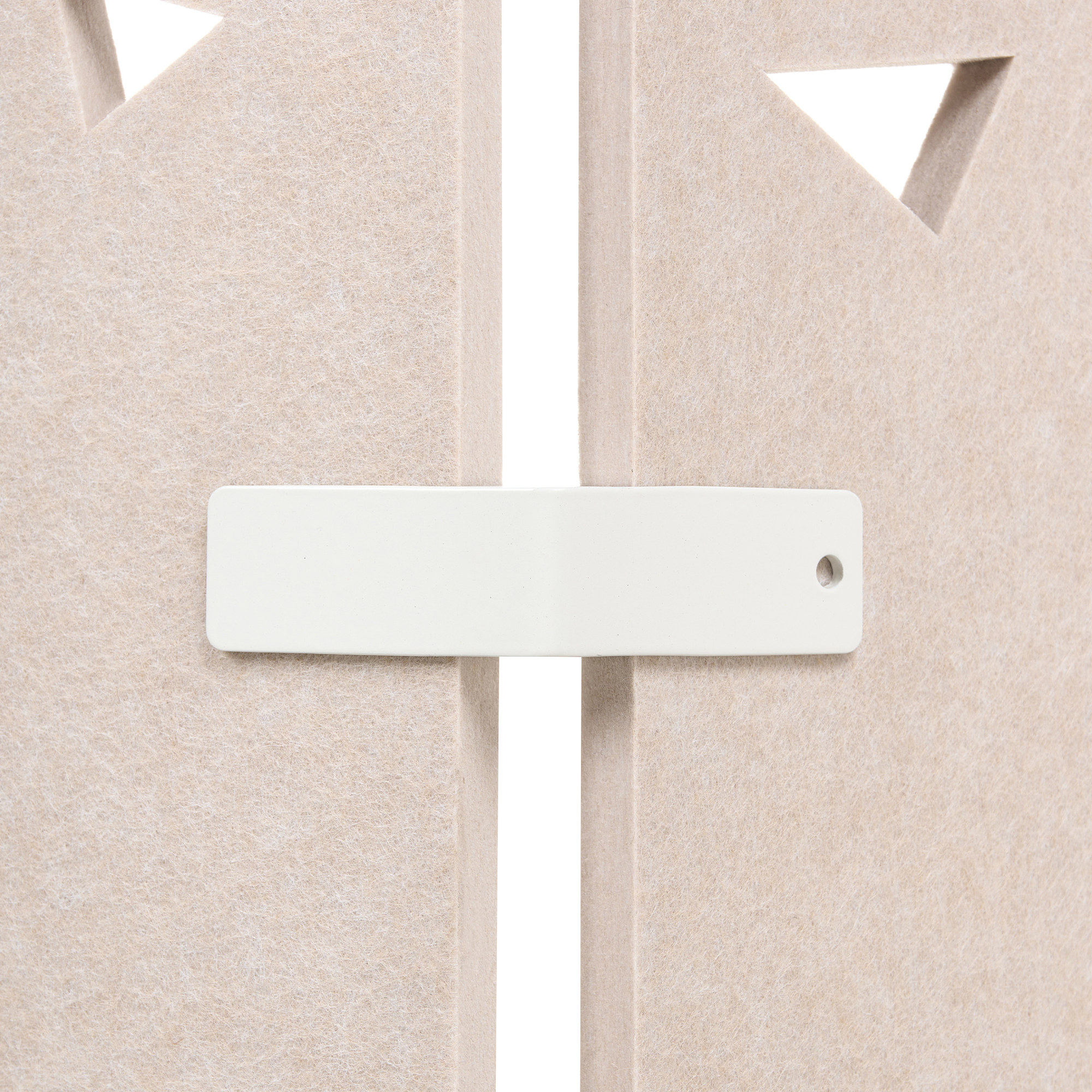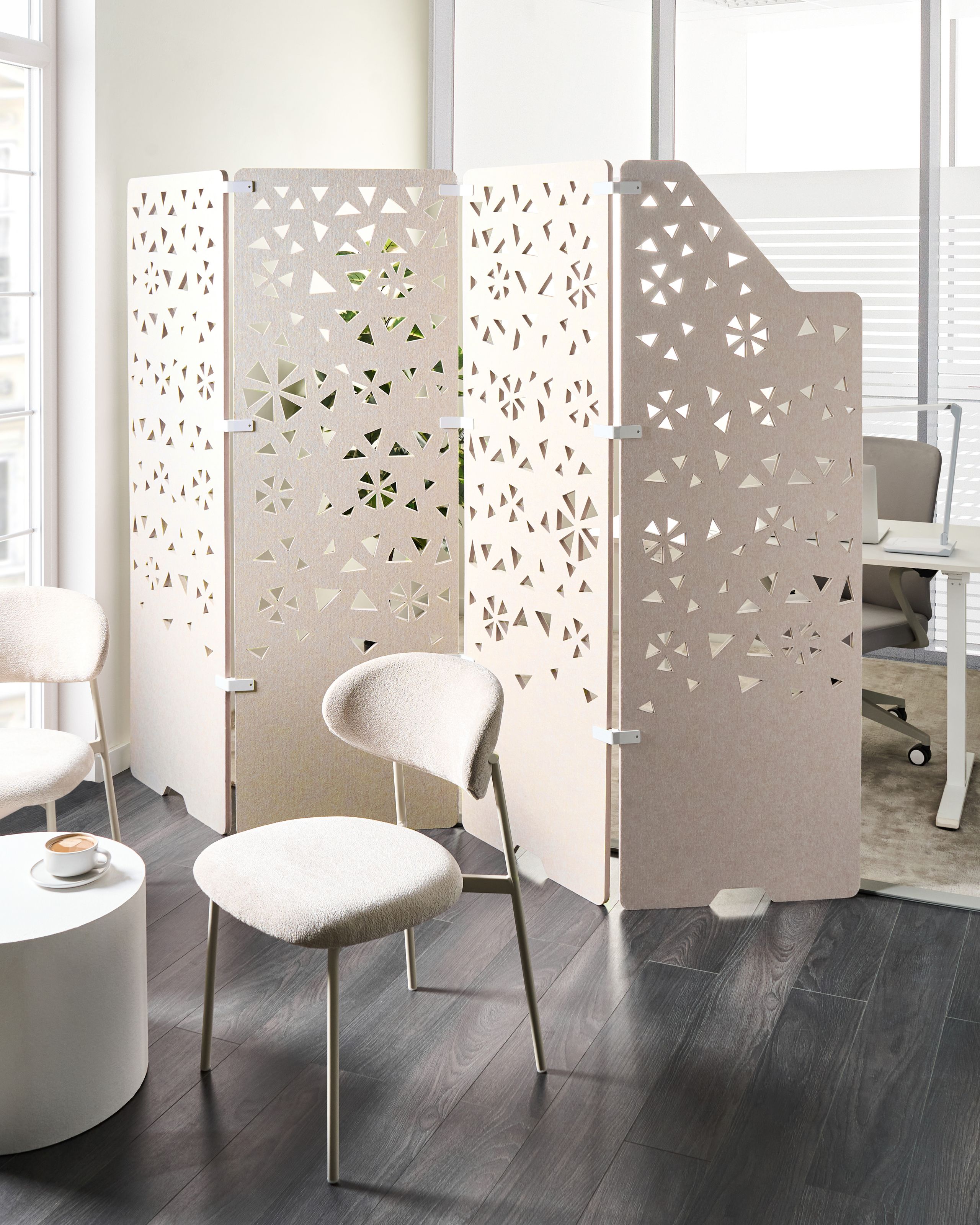 Kokoontaitettava akustinen sermi koristeleikkauksilla. Muunna kotitoimiston ilme tällä vaaleanbeigellä, nelipaneelisella tilanjakajalla, jossa on leikkisä leikattu geometrinen kuvio. Se on suunniteltu parantamaan yksityisyyttä ja vähentämään melua. Se sopii täydellisesti tuomaan tilaan ripauksen persoonallisuutta sekä pitämään sen mukavana ja keskittymistä edistävänä. Tilanjakaja on valmistettu kestävällä polyesterikankaalla verhoillusta synteettisestä materiaalista, jonka vankka mutta kevyt rakenne tekee siirtelystä ja säätämisestä vaivatonta.