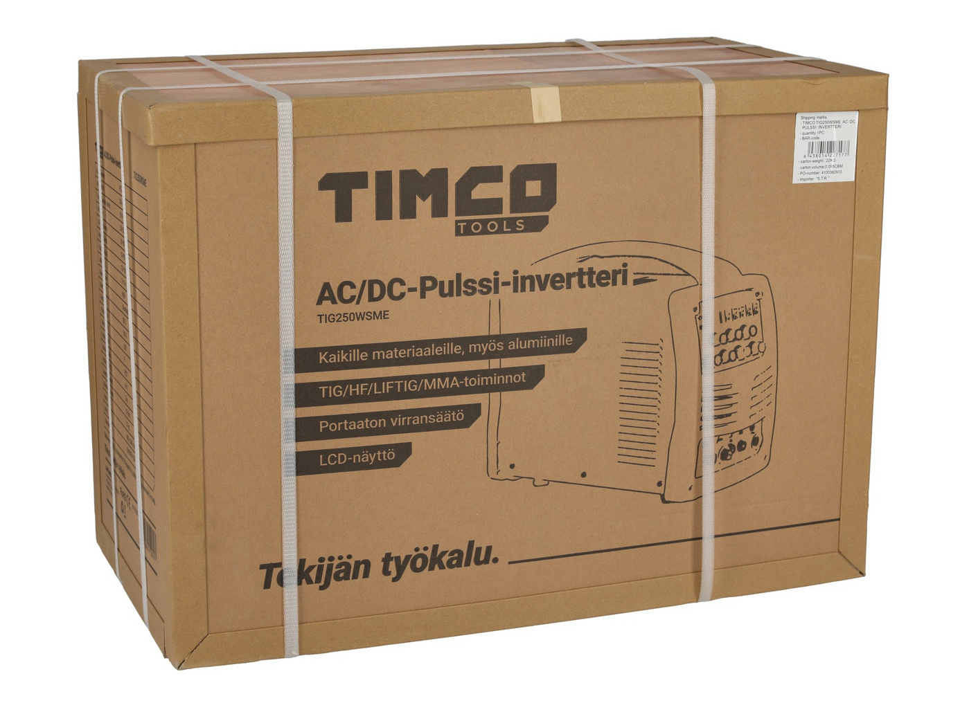 Timco TIG250WSME on uusi AC/DC-pulssi-invertteri, joka on kevyt, kannettava ja todella pienikokoinen TIG-hitsauskone. Se soveltuu kevyeen teollisuuden valmistus-, huolto- korjaus-, maatalous- ja autoteollisuuteen. TIG250WSME on suunniteltu korkealaatuiseen TIG-hitsaukseen. Tällä TIG-hitsauskoneella hitsaat lähes kaikenlaisia metalleja mm. terästä, rosteria, kromia, titaania sekä alumiinia! Kun olosuhteet eivät suosi TIG-hitsausta voit aina vaihtaa puikkokaapelit ja tehdä työn puikolla.