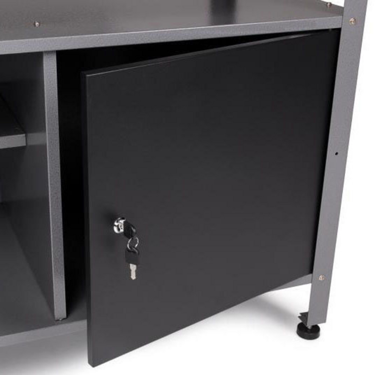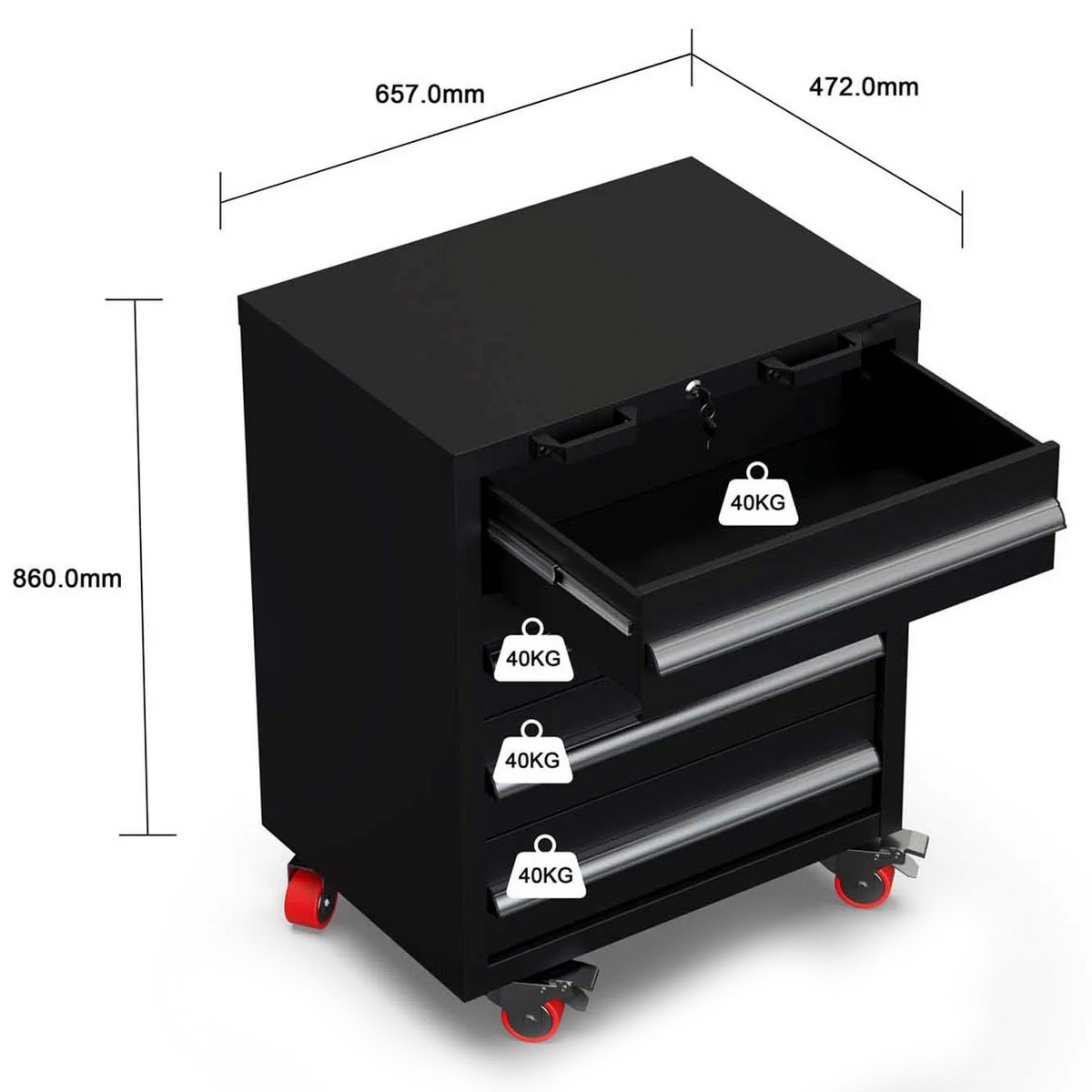 Välitila on täynnä reikälevyseinää, joihin voi halutessaan asentaa koukkuja, telineitä, tasoja yms. työkaluja ja tarvikkeita varten. Kaikki yhdeksän kaappia sekä työkaluvaunu ovat lukittavia. Toimituksen mukana tulee kaksi avainta.