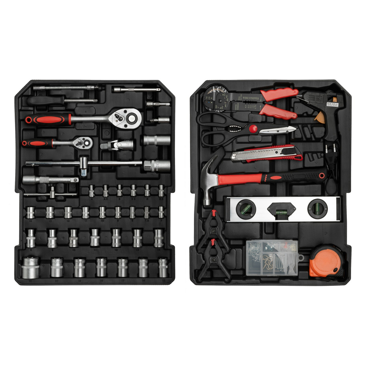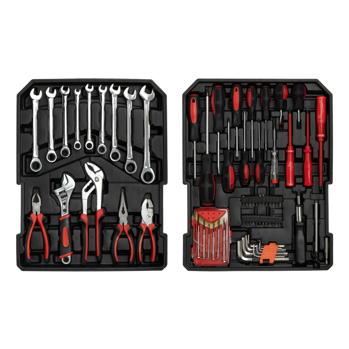 Säilytyssalkku on alumiinia ja siinä on teleskooppinen vetokahva niitä kertoja varten kun haluat viedä työkalut käyttöpaikan luo. Työkalut on pakattu erittäin tiiviisti varastoinnin helpottamiseksi. Jokaiselle työkalulle on oma merkitty paikkansa salkussa. Sisältää mm. hylsysarjan, lista-avainsarjan, pihtisarjan, ruuvimeisselisarjan, kuusiokolosarjan, kärkisarjan, vatupassin, kiinnikkeitä ja mittanauhan sekä muita yksittäisiä työkaluja. Työkaluille on tehty lämpökäsittely joka parantaa lujuutta ja työkalujen elinikää huomattavasti. Lämpökäsittelyn lujuusaste 45. Lista-avaimet ja hylsyt 45 lujuusasteen lämpökäsiteltyä vähähiilistä terästä, Räikät ja kärkisarjat chrome vanadiumia.