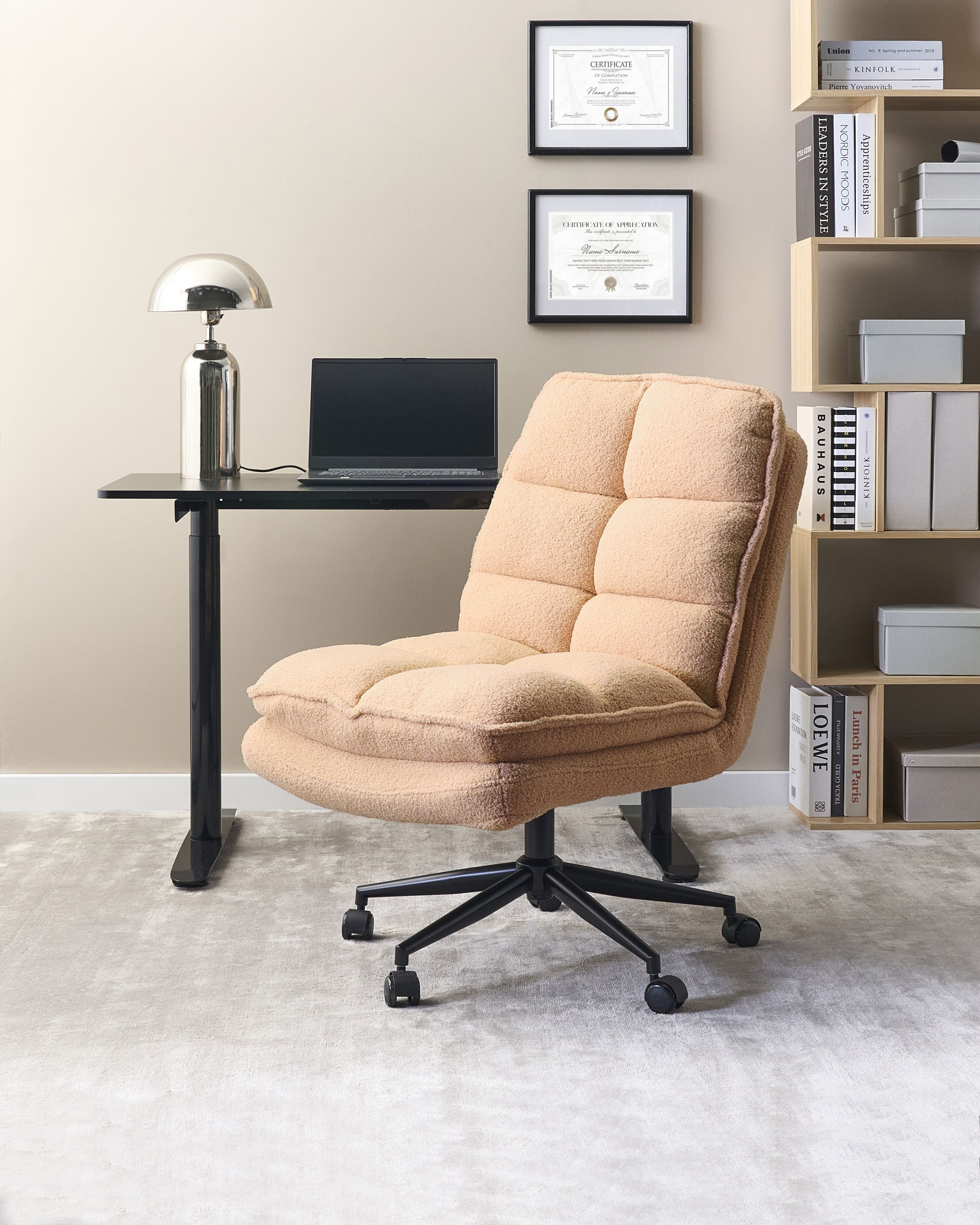 Pehmustettu säädettävä toimistotuoli. Tämä työtuoli sopii kaikille, jotka arvostavat sekä mukavuutta että muotoilua. Se on verhoiltu muhkealla bukleekankaalla, joka tuo pehmeän ja ylellisen tunnelman mihin tahansa huoneeseen. Kangas ei ainoastaan lisää lämpöä, vaan tarjoaa myös mukavan istumakokemuksen, joka sopii täydellisesti pitkiin työtunteihin tai rentoutumiseen. Selkänoja on säädettävissä neljään eri asentoon, jolloin voit löytää ihanteellisen kulman, ja sen voi asettaa myös täysin tasaiseksi, tarjoten lisää joustavuutta hetkiin, kun haluat rentoutua. Säädettävän korkeuden ansiosta tuoli voidaan räätälöidä työpöytääsi ja henkilökohtaisiin mieltymyksiisi sopivaksi, kun taas sulava 360 astetta kääntyvä jalusta takaa vaivattoman liikkumisen työtilassa. Tämä eleganssia ja ergonomisia ominaisuuksia yhdistävä tuoli on täydellinen lisä mihin tahansa kotitoimistoon, tarjoten sekä käytännöllisyyttä että tyyliä. Olipa kyse työskentelystä, virtuaalikokouksista tai tauon pitämisestä, työtuoli tukee tarpeitasi mukavasti ja tyylillä sekä sopii saumattomasti mihin tahansa moderniin sisustukseen.