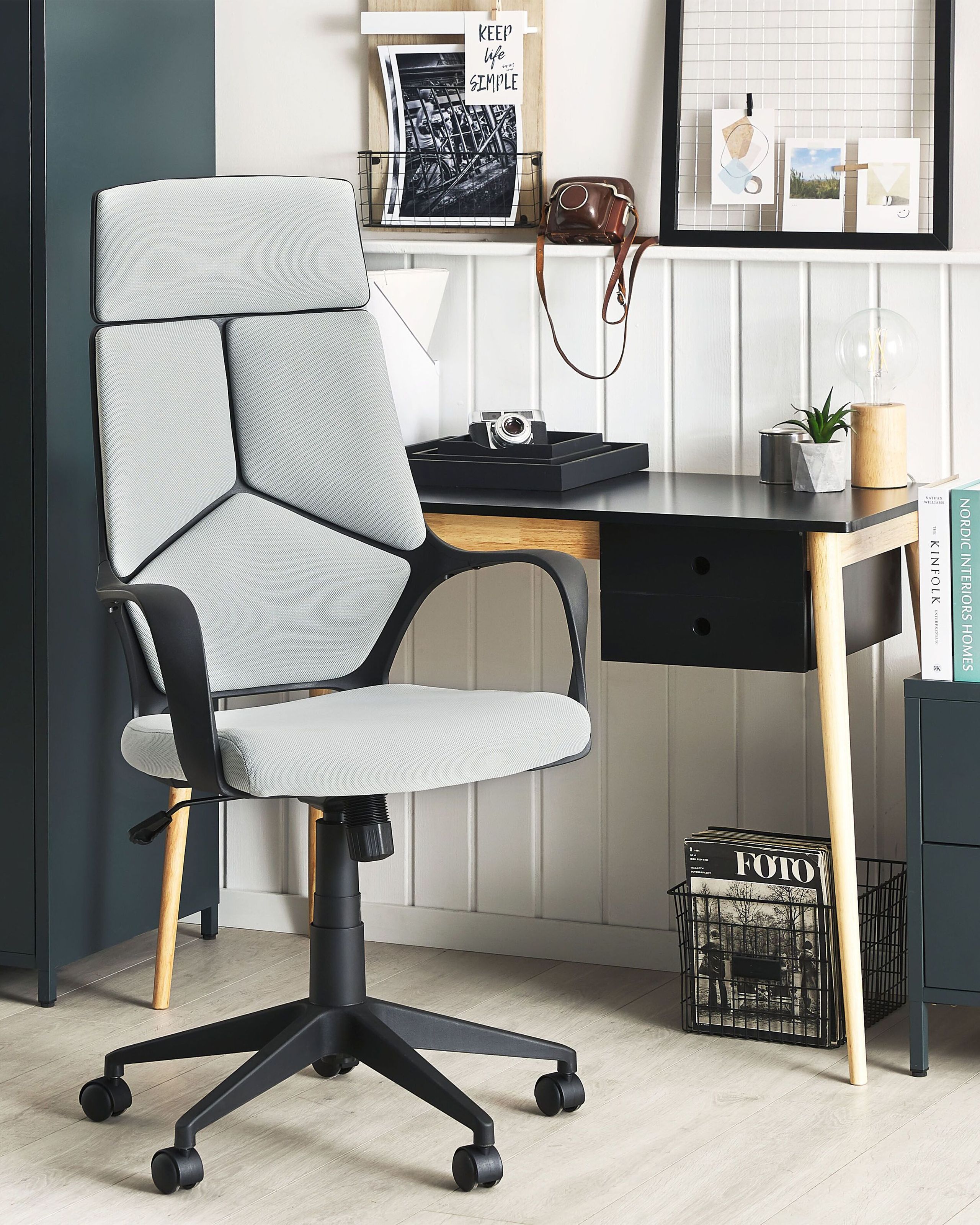 Korkeussäädettävä ja kallistuva työtuoli. Tämä moderni, ergonomisesti muotoiltu toimistotuoli on tyylikäs ja mukava lisä jokaiseen työtilaan tai kotitoimistoon. Kallistuvan selkänojan ja säädettävän istuinkorkeuden ansiosta se on helppo mukauttaa tarpeisiin sopivaksi. Korkeassa selkänojassa on niskatuki, joka varmistaa oikean pään asennon pitkien työpäivien aikana. Paksusti pehmustettu istuin ja selkänoja on verhoiltu miellyttävän tuntuisella ja kestävällä polyesterikankaalla.