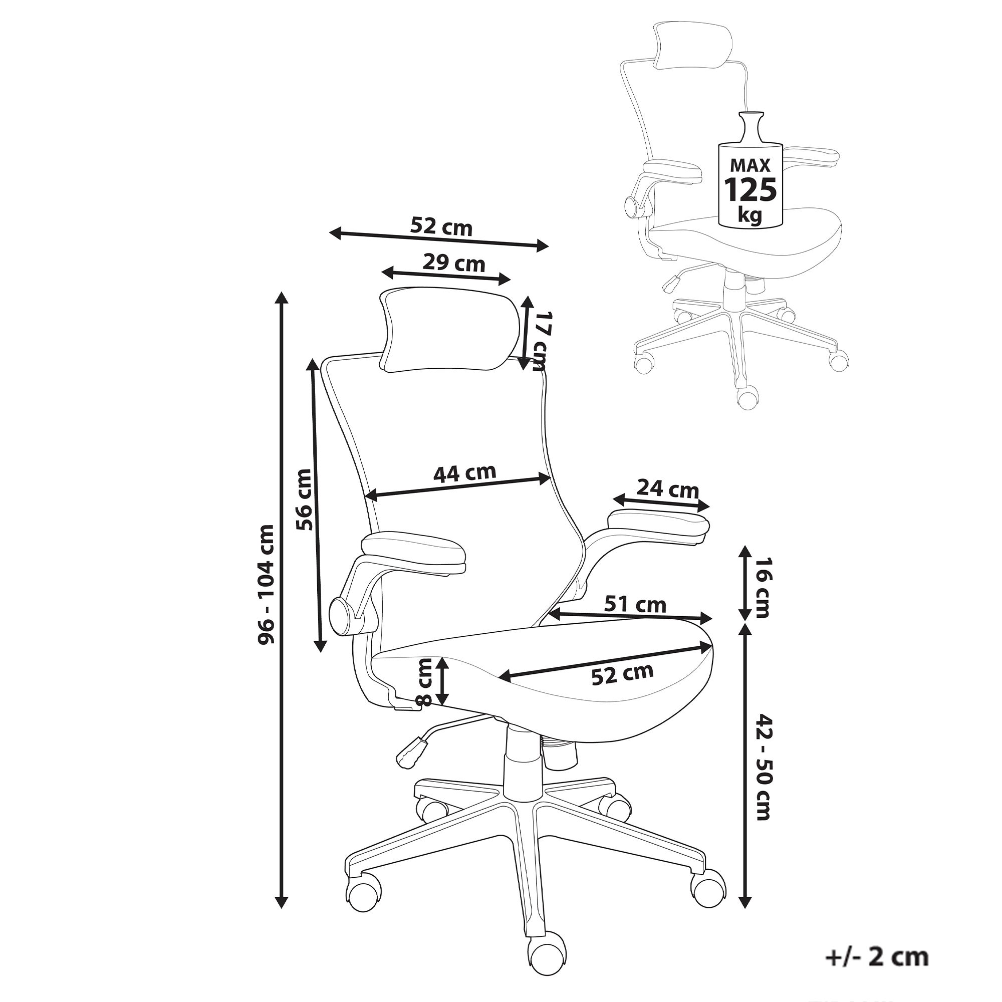 Ominaisuudet: 360° kääntyvä, Kallistusmekanismi jäykän selän helpottamista varten, Pneumaattinen istuinkorkeuden säätö, Tasaisesti rullaavat pyörät, Hengittävä verkkokangas parantaa ilmankiertoa, Säädettävä niskatuki, Säädettävät käsinojat