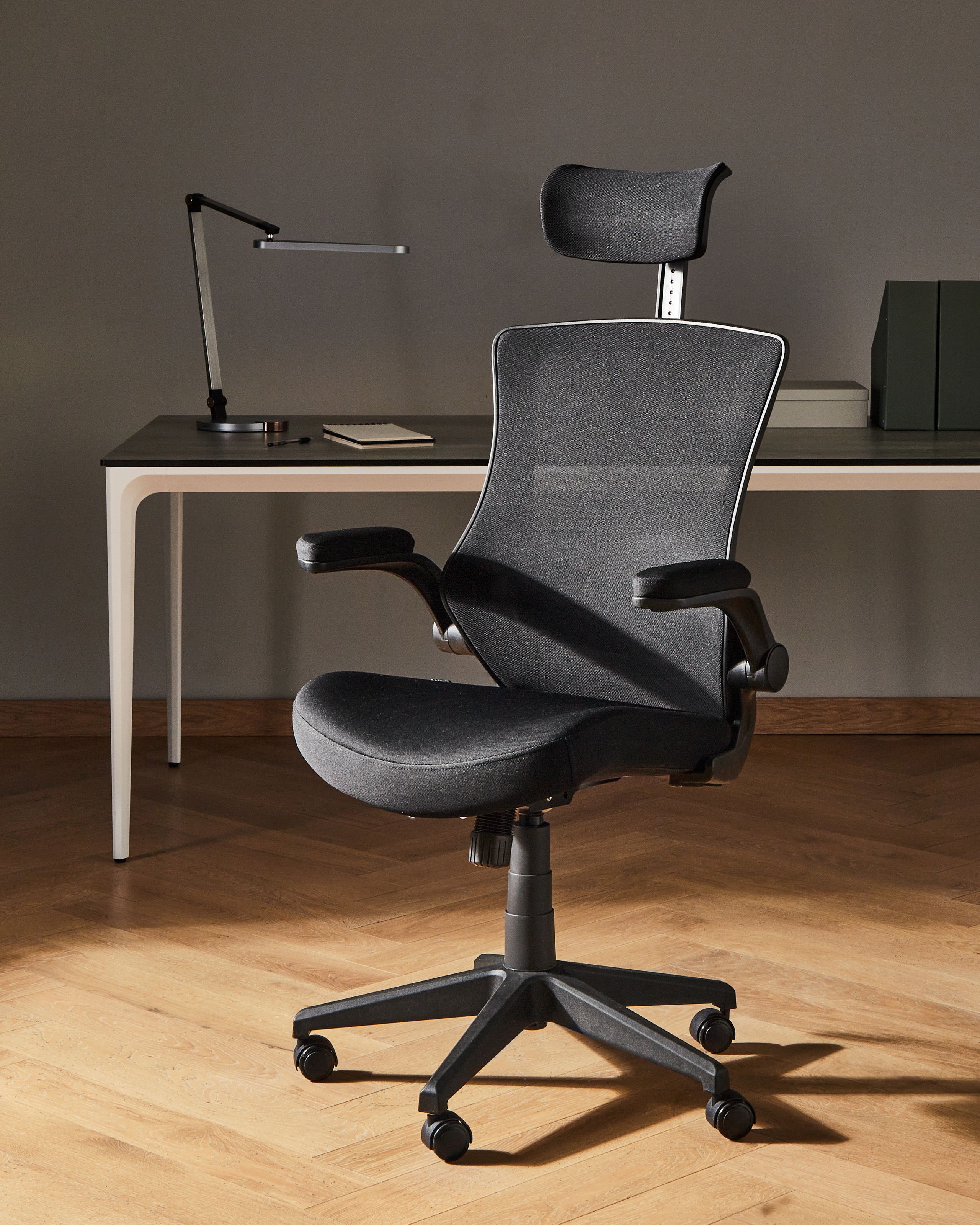 Ergonominen toimistotuoli säädettävillä käsinojilla. Tämä ammattilaistason toimistotuoli yhdistää monipuolisuuden ja hengittävän verkkokankaan mukavuuden, mikä tekee siitä ihanteellisen pitkiin työpäiviin. Kallistusmekanismi helpottaa selän jännitystä, ja pneumaattinen korkeuden säätö takaa oikean asennon minkä tahansa työpöydän ääressä. Sekä käsinojat että niskatuki ovat säädettävissä, mikä tarjoaa räätälöidyn tuen hartioille, niskalle ja käsille. Sulavasti rullaavat pyörät varmistavat vaivattoman liikkumisen ja tekevät työskentelystä miellyttävää koko päivän ajan.