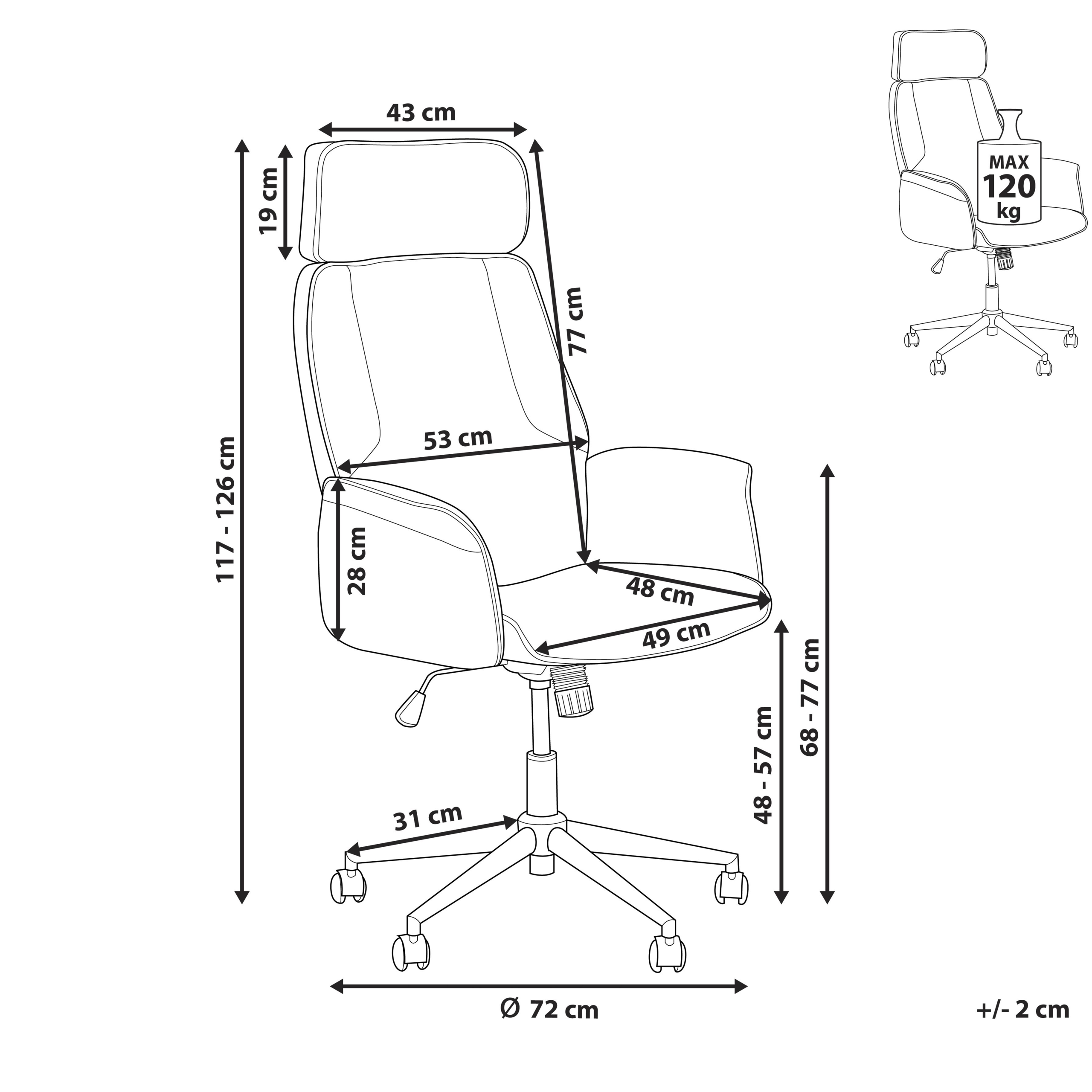 Ominaisuudet: 360° kääntyvä, Tasaisesti rullaavat pyörät, Turvajarrutoiminto lukitsee pyörät turvallisuuden varmistamiseksi ja avaa lukituksen liikkuvuuden mahdollistamiseksi, Kallistusmekanismi jäykän selän helpottamista varten, Ergonominen, kallistuva selkänoja, Moderni muotoilu, Luotettava työn laatu
