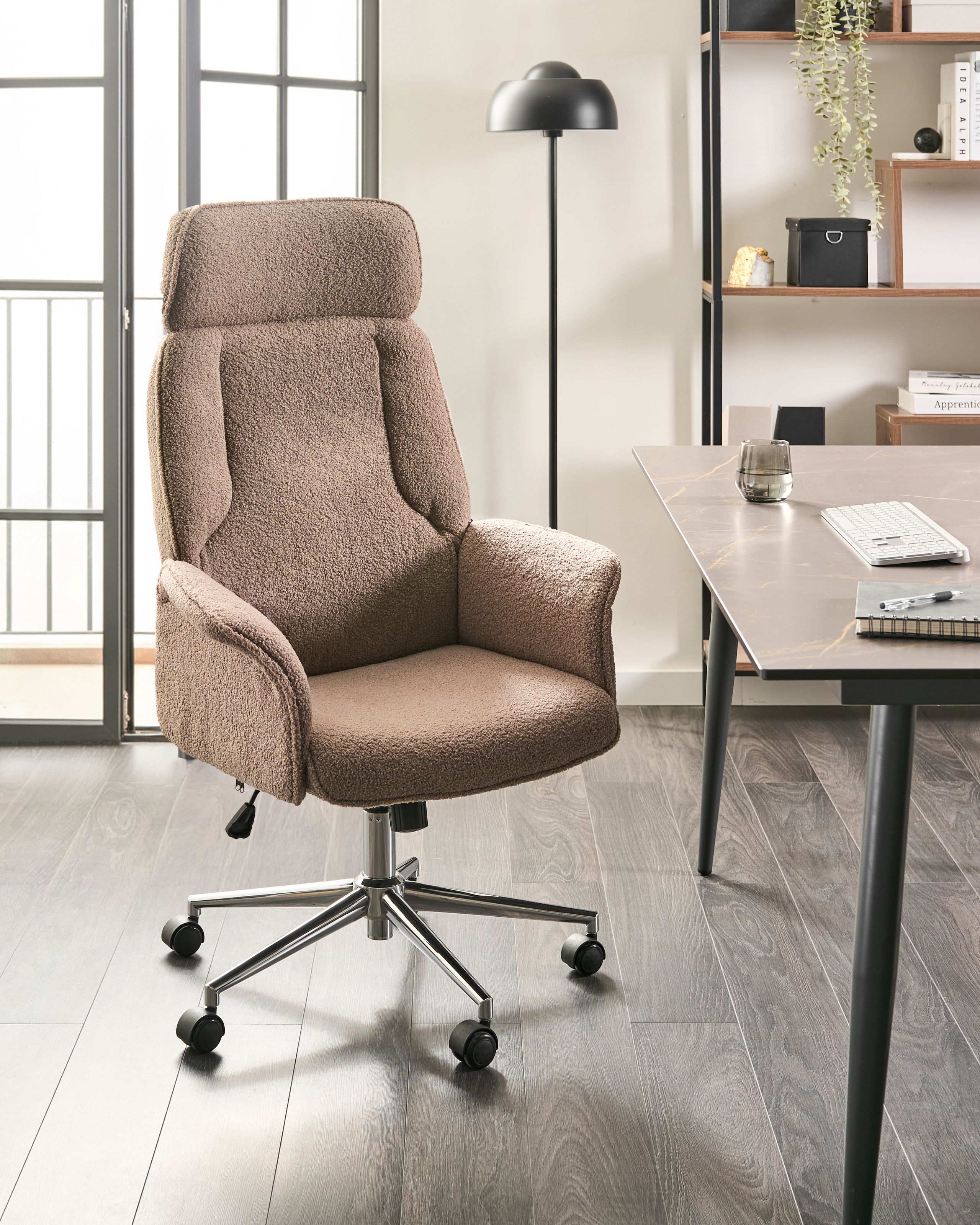 Minimalistinen tietokonetuoli leveällä selkänojalla. Tee työskentelystä mukavampaa tällä tyylikkäällä toimistotuolilla. Korkealaatuisella ruskealla bukleekankaalla verhoiltu istuinosa on täytetty pehmeällä vaahtomuovilla maksimaalisen istumismukavuuden varmistamiseksi. Työtuoli kääntyy 360 astetta, ja sen istumiskorkeutta on helppo säätää tarpeen mukaan. Mukava niskatuki ja levenevät käsinojat tekevät siitä optimaalisen valinnan sekä opiskeluun että työskentelyyn.
