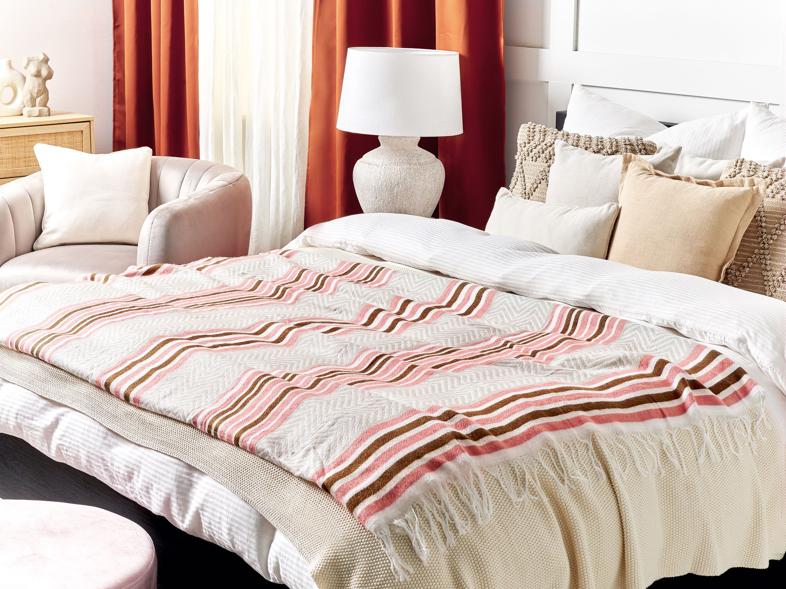 Raidallinen viltti tupsuilla. Kohenna kotisi ilmettä tällä tyylikkäällä, suorakulmaisella viltillä. Akryylistä ja polyesteristä valmistettu huopa on erittäin lämmin ja miellyttävän tuntuinen. Vaaleanpunaisen ja ruskean värisiä, paksuja raitoja korostavat beigen ja luonnonvalkoisen sävyinen siksak-kuvio. Viltti on täydellinen lisä mihin tahansa moderniin sisustukseen.