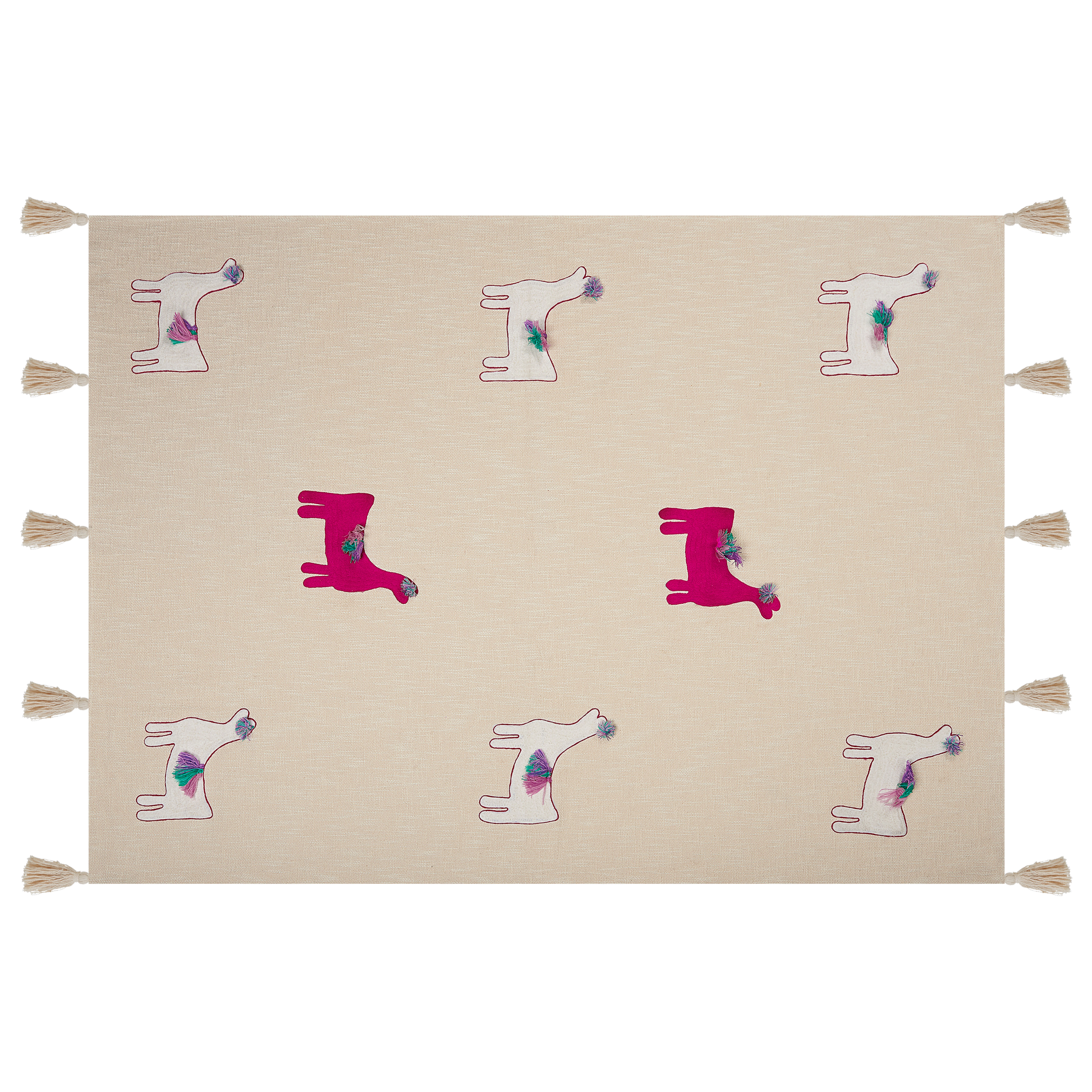 Koristeellinen laamakuvioitu viltti tupsuilla. Puuvillasta valmistettu viltti on pehmeä ja lämmin lisä sohvalle tai sängylle. Suloinen käsin tikattu laamakuvio ja tyylikkäät tupsut tekevät matosta hauskan lisän mihin tahansa sisustukseen. Materiaalinsa ansiosta huopa on pitkäikäinen ja se voidaan pestä pesukoneessa.