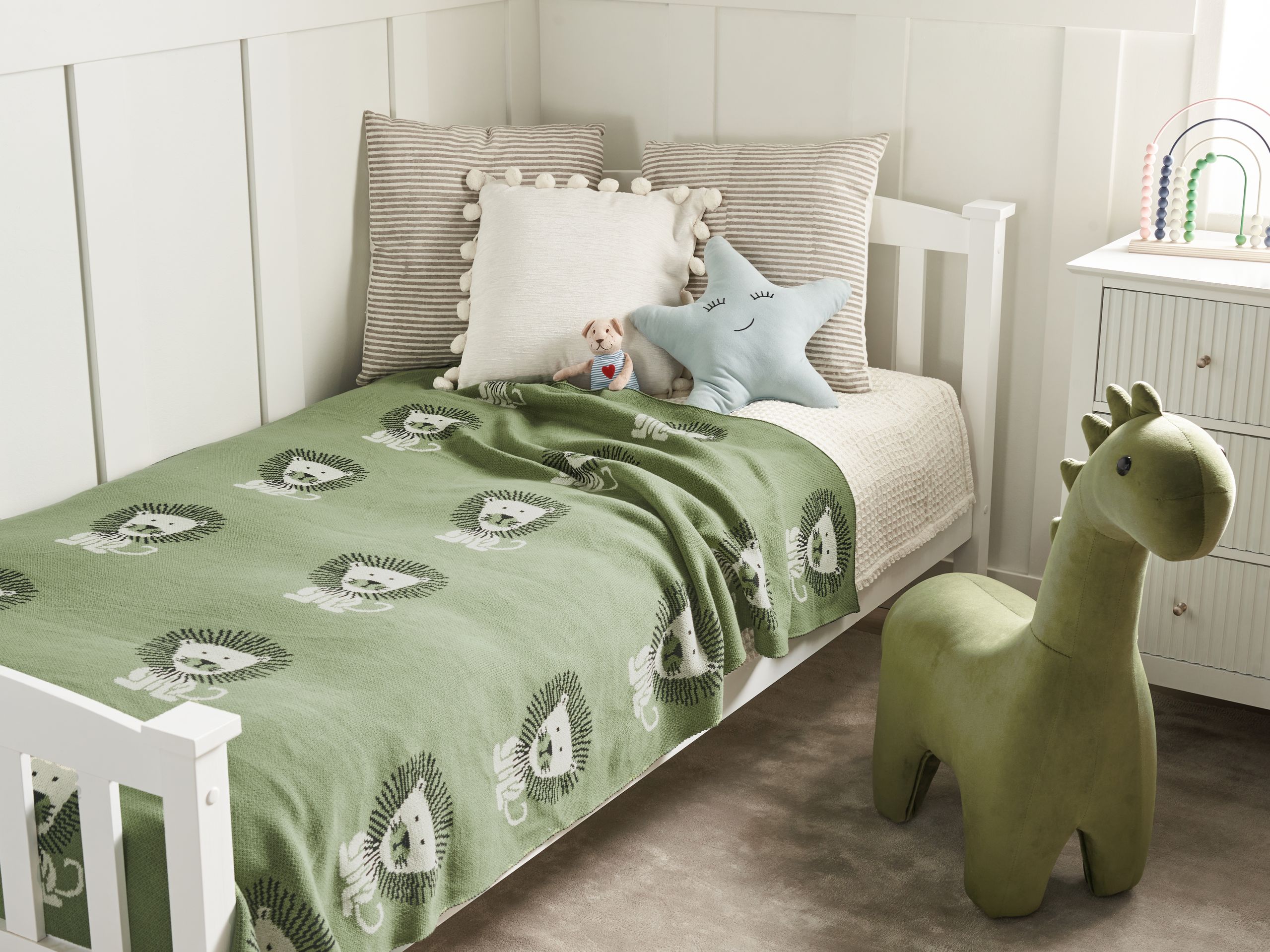 Moderni lasten viltti leijonakuviolla. Tuo ripaus seikkailua lapsesi huoneeseen tällä viehättävällä leijona-aiheisella torkkupeitolla. Se on valmistettu miellyttävän tuntuisesta puuvillasta, tarjoten mukavuutta ja lämpöä, kun taas konepestävyytensä ansiosta peittoa on helppo hoitaa. Lämmin, kodikas vihreä väri sopii monenlaiseen sisustukseen, mikä tekee torkkupeitosta monipuolisen lisän. Tämä peitto on ihastuttava tapa täydentää lapsesi tilaa leikkisällä mutta käytännöllisellä tavalla.