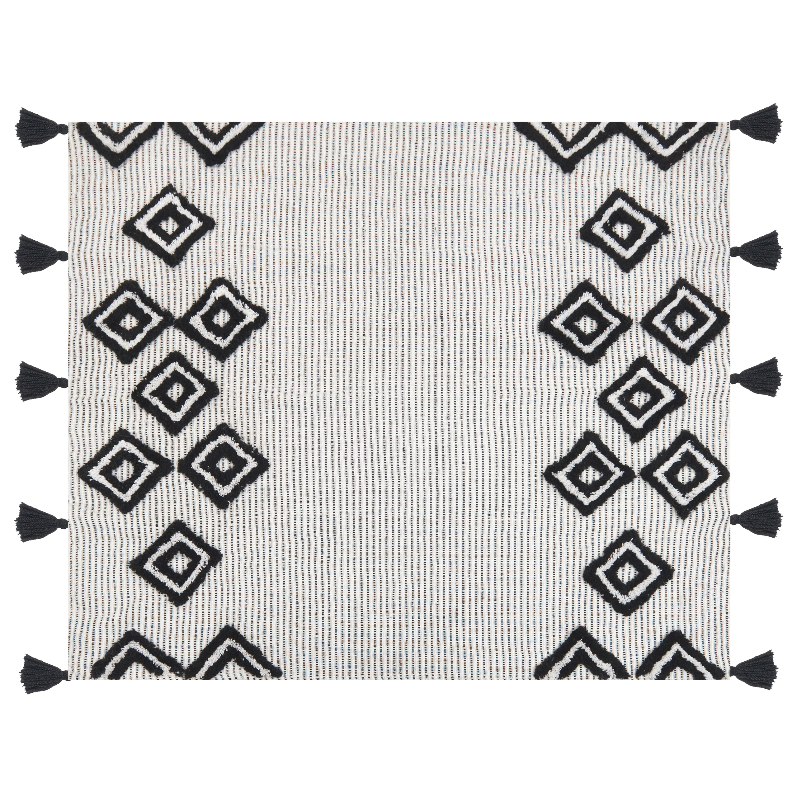 Geometrisesti kuvioitu viltti tupsuilla. Koe nykyaikaisen tyylin huipentuma tämän tyylikkään, käsin tehdyn torkkupeiton avulla. Sen valkoista pintaa koristaa näyttävä musta geometrinen kuviointi, joten viltti on helppo yhdistää erilaisiin sisustustyyleihin. Huopa on valmistettu kierrätetystä polyesteristä käsin, minkä ansiosta se on sekä kestävä että pehmeä, tarjoten mukavuuden viileinä iltoina. Ympäristöystävällisyytensä lisäksi se on myös erittäin helppohoitoinen.