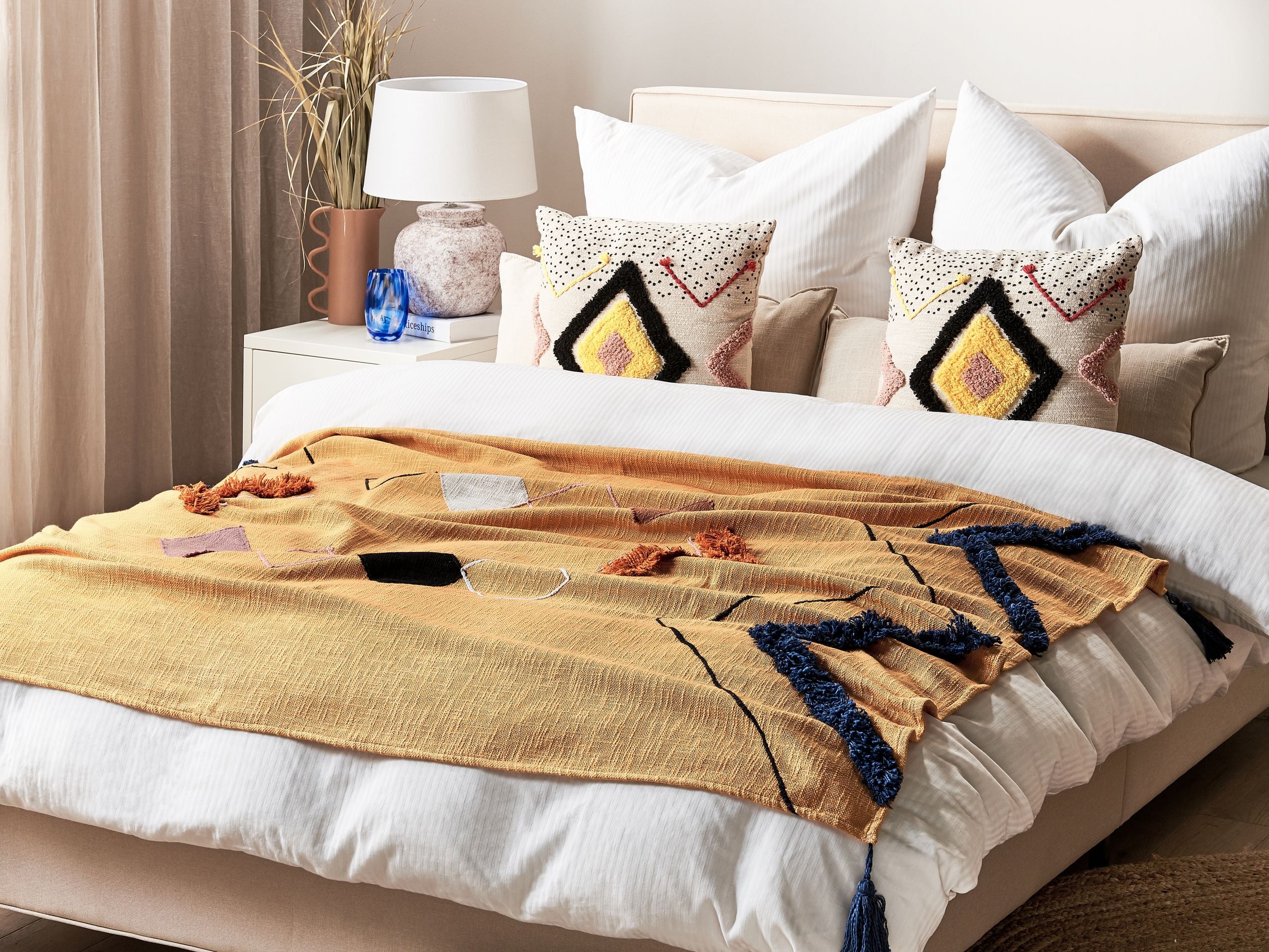 Koristeellinen viltti geometrisella kuviolla. Tuo väriä makuu- tai olohuoneeseen ja luo mukava tunnelma tällä oranssilla viltillä. Se on valmistettu käsin korkealaatuisesta puuvillasta, joka pitää lämpimänä viileinä iltoina. Monivärinen geometrinen kuvio ja suloiset tupsut antavat huovalle eksoottisen ilmeen ja tekevät siitä täydellisen koristeen.