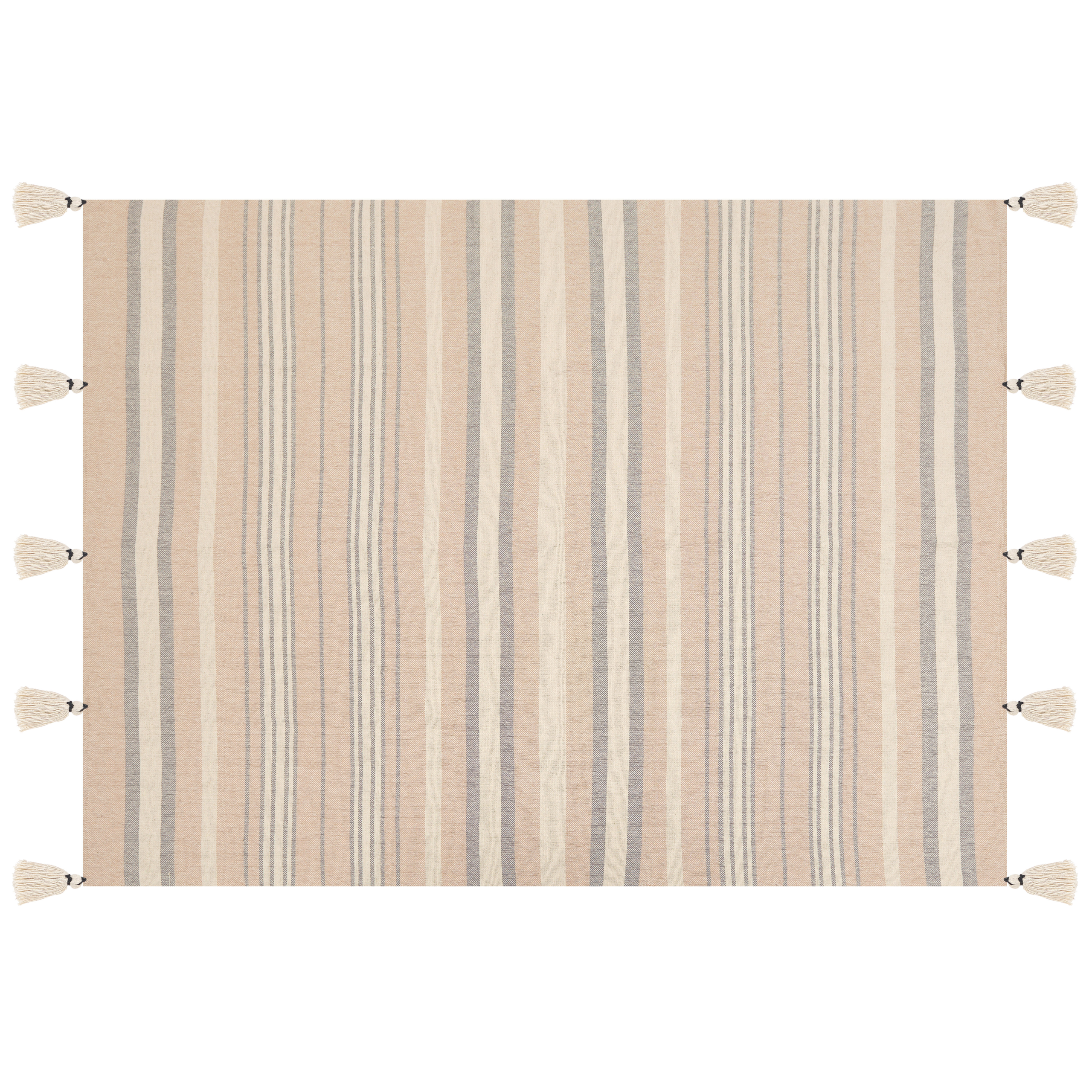 Moderni huopa raitakuvioinnilla ja tupsuilla. Kaunista jokapäiväistä tilaasi tällä torkkupeitolla, joka luo huoneeseen kuin huoneeseen kodikkaan ja viihtyisän tunnelman. Se on valmistettu käsin puuvillan ja polyesterin sekoituksesta, minkä ansiosta se on erittäin kestävä, pehmeä sekä lämmin. Lisäksi se ei vaadi paljoa ylläpitoa kestääkseen useita vuosia. Huovassa on raidallinen kuviointi, joka koostuu beigen, mustan ja luonnonvalkoisen eri sävyistä. Päitä koristavat koristeelliset tupsut.