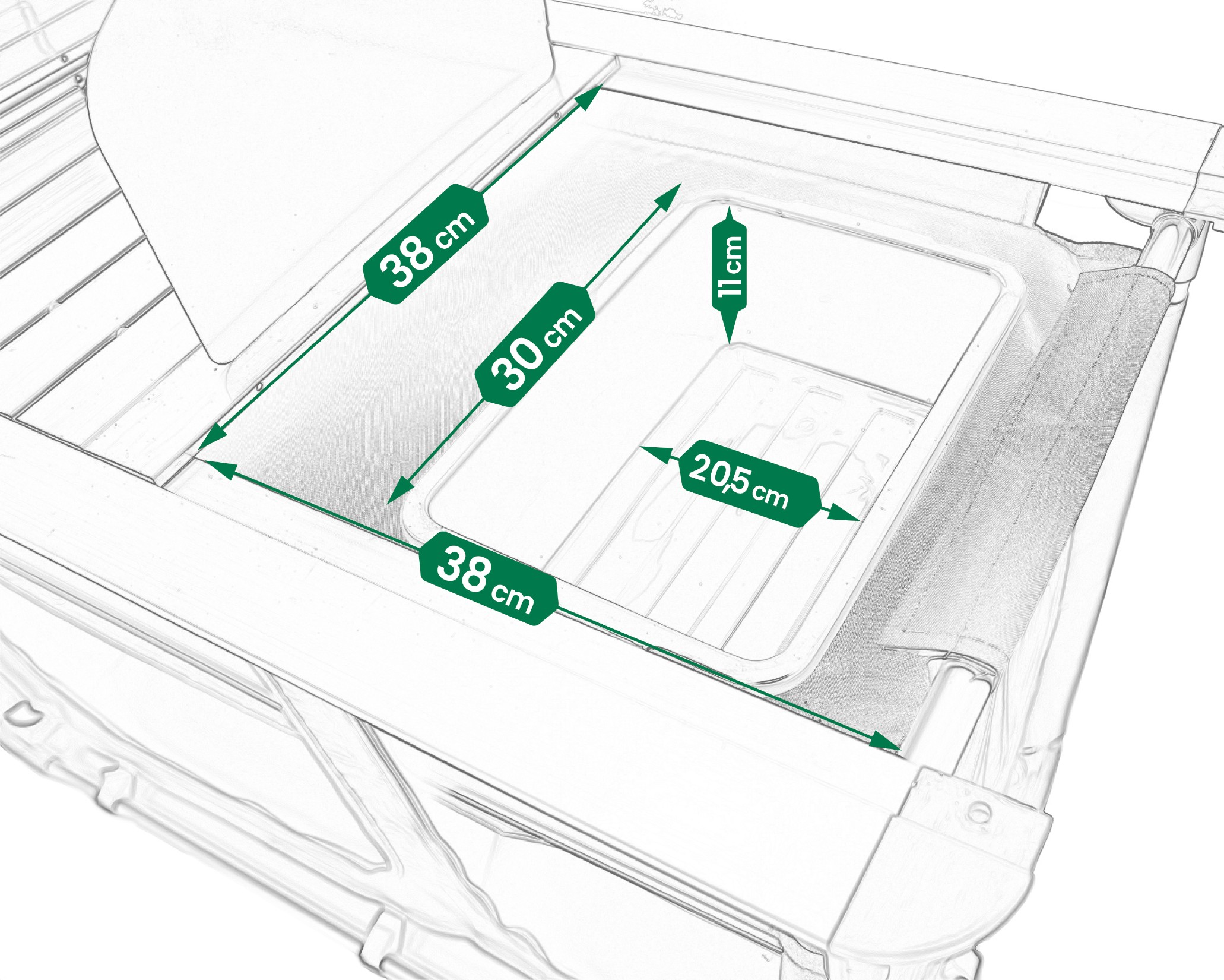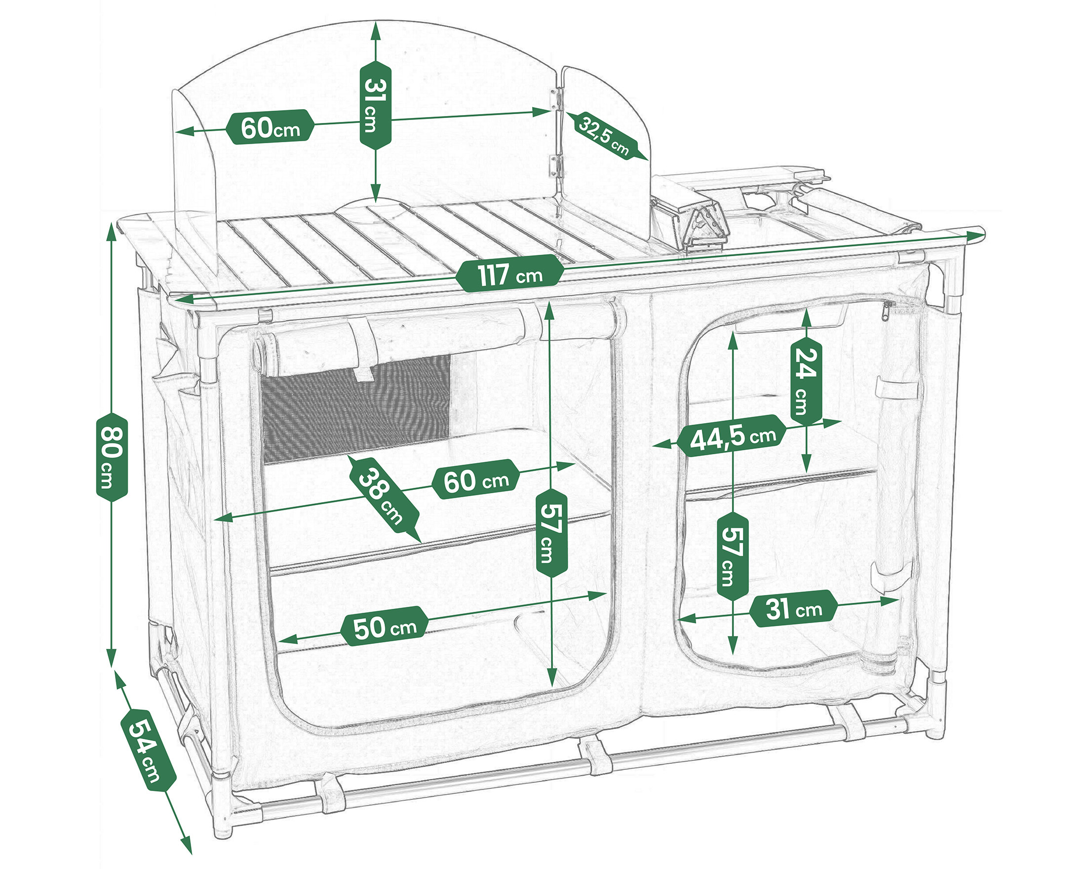 Suuri kapasiteetti: Leirikeittiössä on metallinen työtaso, jonka päälle voidaan asettaa liesi. Sarja sisältää kaksi riippuvaa kaappia vahvistetuilla hyllyillä ruoan, astioiden ja muiden välttämättömien tavaroiden säilyttämistä varten.