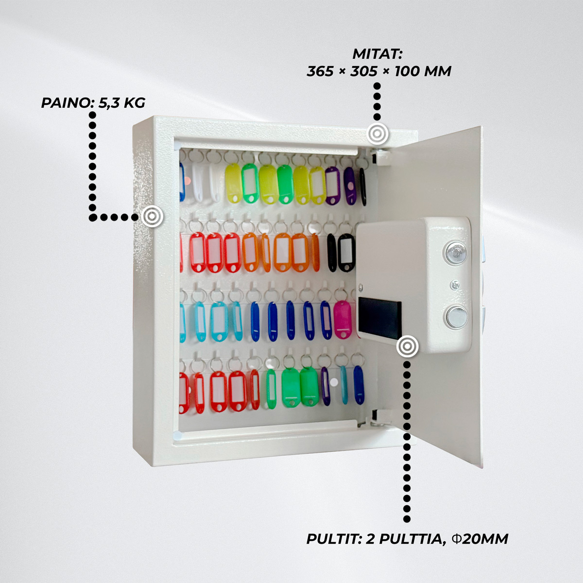 Numeroidut avainlaput ja selkeä rakenne takaavat, että jokaisella avaimella on oma paikkansa, mikä nopeuttaa käyttöä ja ehkäisee katoamisia.