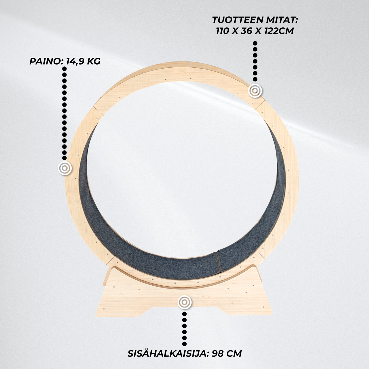 Sopii myös suurille kissoille: XL-koko ja 98 cm sisähalkaisija mahdollistavat luonnollisemman juoksuasennon.