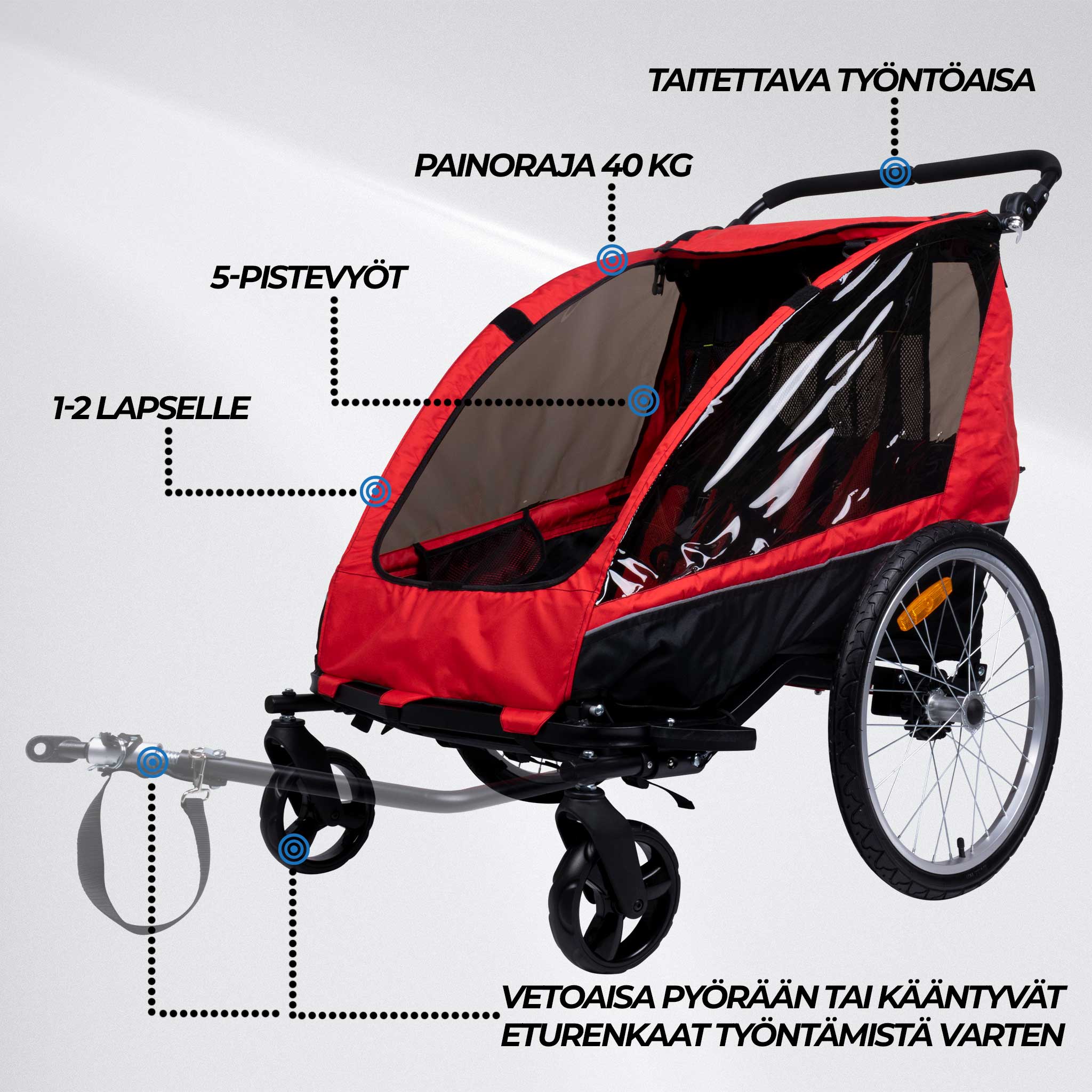 Pehmustettu istuin ja 5-pistevyö tekevät kärrystä turvallisen kuljettaa lapsia. Peräkärryssä on myös turvallisuutta kohentava seisontajarru. Peräkärryn mukana tulevan juoksusarjan avulla muunnat kärryn helposti juoksukärryksi. Kärryssä on myös taitettava työntöaisa. Heijastimet ja turvalippu tekevät siitä helposti huomattavan liikenteessä.