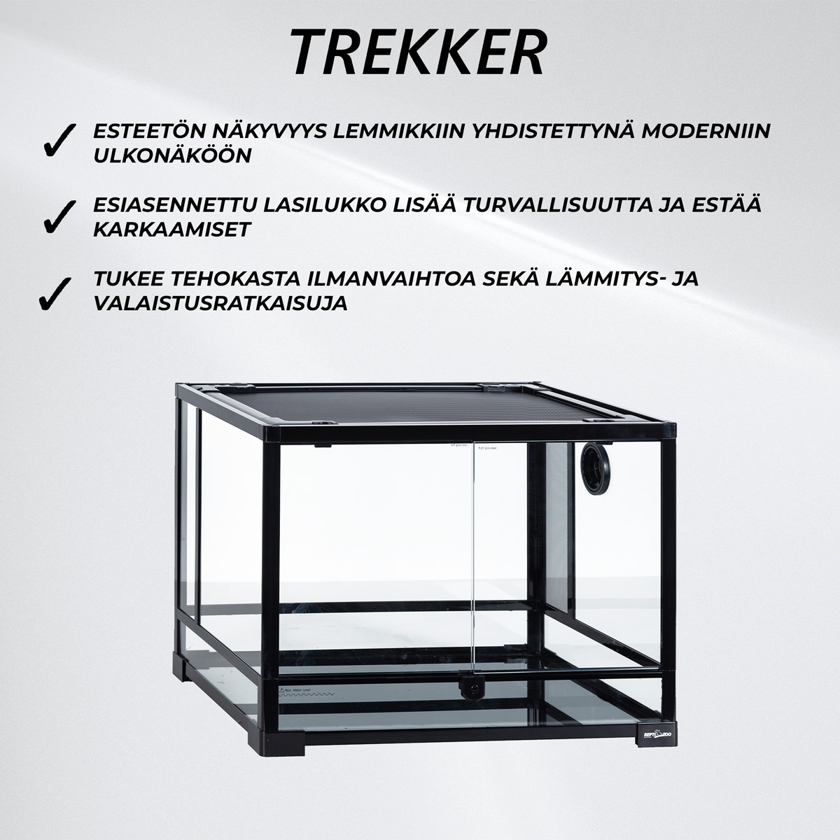 Tuo luonnon kauneus kotiisi <strong>Trekker Terraariolla</strong>, joka on suunniteltu tarjoamaan matelijoille ja pieneläimille turvallinen, toimiva ja esteettisesti miellyttävä elinympäristö. Tämä laadukas terraario yhdistää erinomaisen näkyvyyden, kestävän rakenteen ja harkitut yksityiskohdat, jotka tukevat lemmikkisi hyvinvointia.