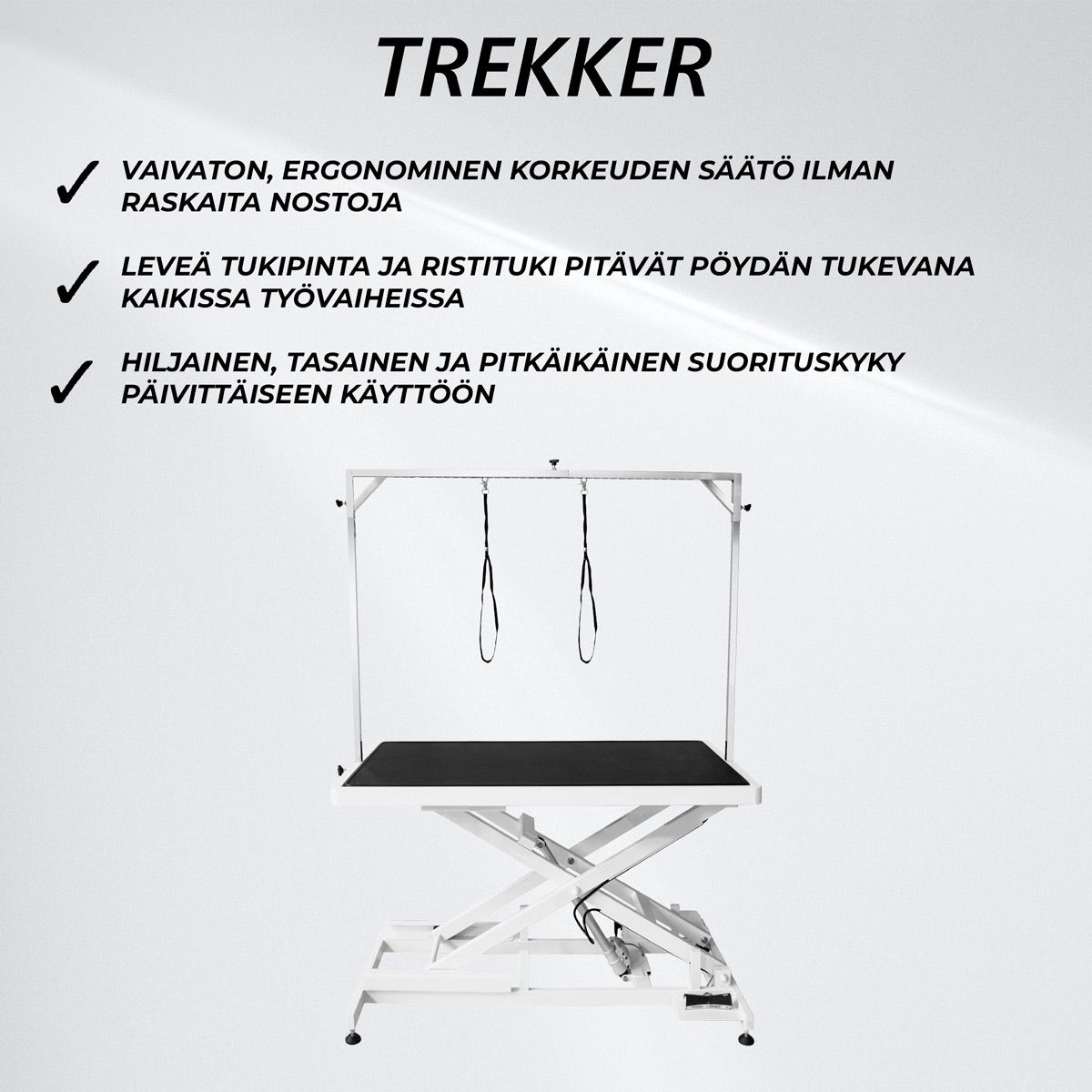 <p>Esittelemme Trekker Trimmauspöytä Pron - koira ystävällinen, turvallinen ja vakaasti suunniteltu trimmauspöytä. Tämä tuote on erinomainen valinta jokaiselle lemmikin omistajalle tai ammattimaiselle eläintenhoitajalle. Sähköisesti säädettävä korkeus tekee jokaisesta trimmaushetkestä mukavan sekä trimmaajalle että koiralle. Sen X-tyyppinen design mahdollistaa stabiilin ja turvallisen trimmauskokemuksen. Trekker on tunnettu tuotemerkki, johon luotat paitsi silloinkin, kun kyseessä on koiran trimmauspöytä.</p>