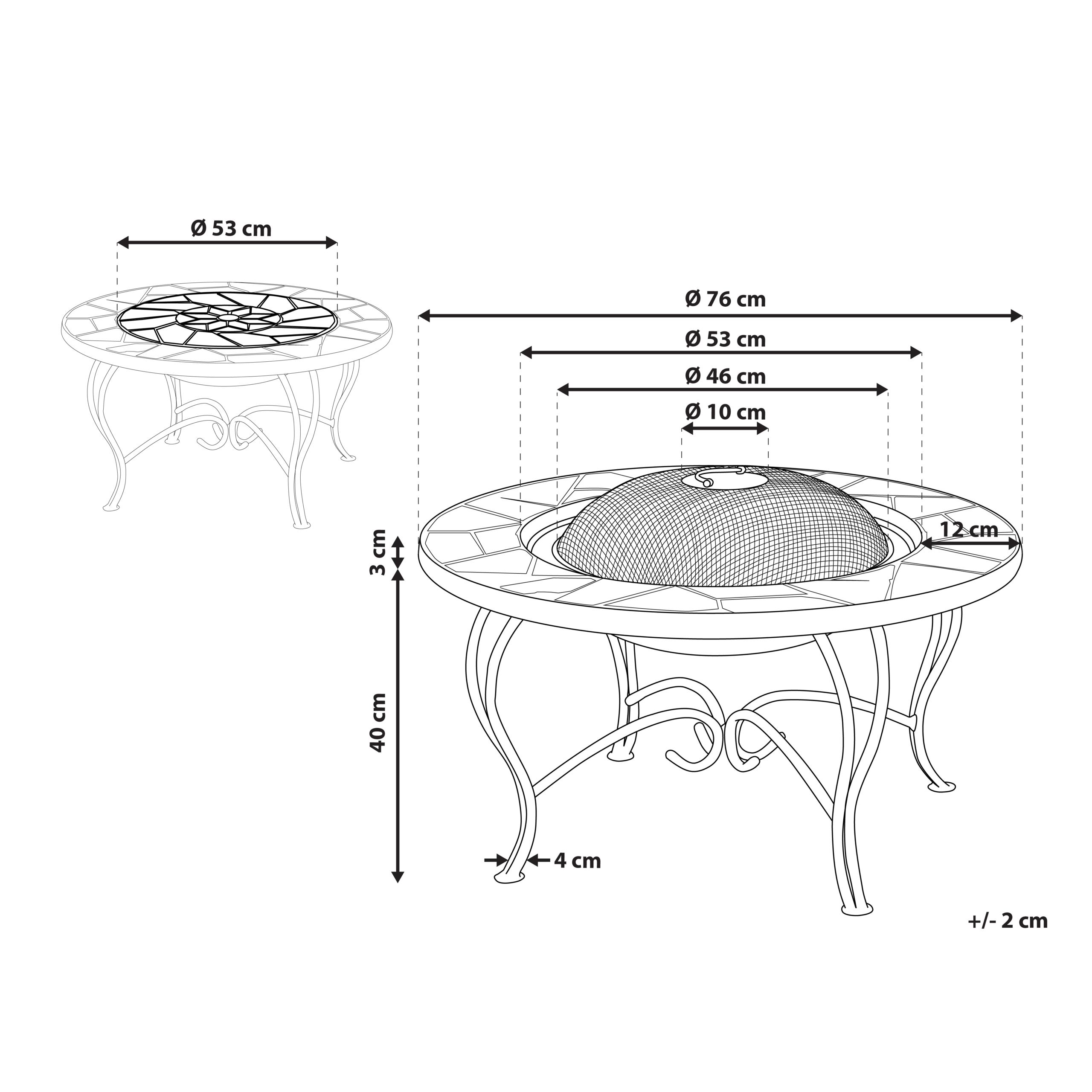 Mosaiikkinen pyöreä tulisija. Tässä tulisijassa yhdistyvät lämmitys-, grillaus- ja pöytätoiminnot yhdessä käytännöllisessä yksikössä – täydellinen viileämpiin iltoihin sekä kokoontumisiin ulkona grillauskauden aikana ja sen jälkeen. Voit käyttää tulisijaa klassisena lämmönlähteenä, valmistaa yksinkertaisia aterioita mukana tulevan grilliritilän avulla tai asettaa kannen päälle ja tehdä siitä kätevän ulkopöydän. Vaihtaminen toimintojen välillä on nopeaa ja vaivatonta, eikä se vaadi ylimääräisiä työkaluja tai asennusta. Teräksiset runko ja tulipesä on rakennettu kestämään toistuvaa ulkokäyttöä, ja mukana tulevat kipinäsuoja sekä hiilihanko takaavat turvallisen ja helpon käytön. Kompaktin kokonsa ansiosta tulisija on helppo säilyttää ja on käyttövalmis heti, kun otat sen ulos pakkauksestaan.
