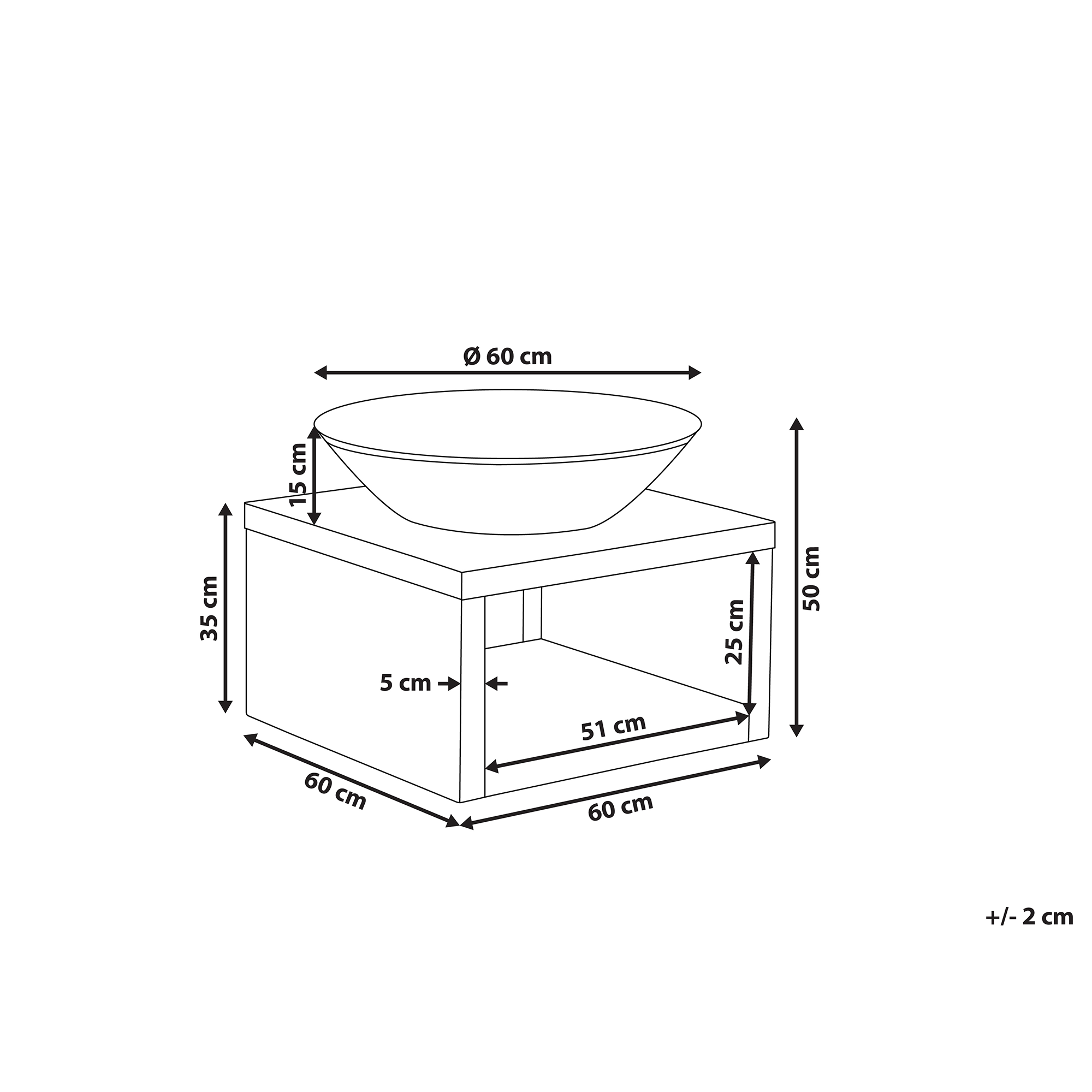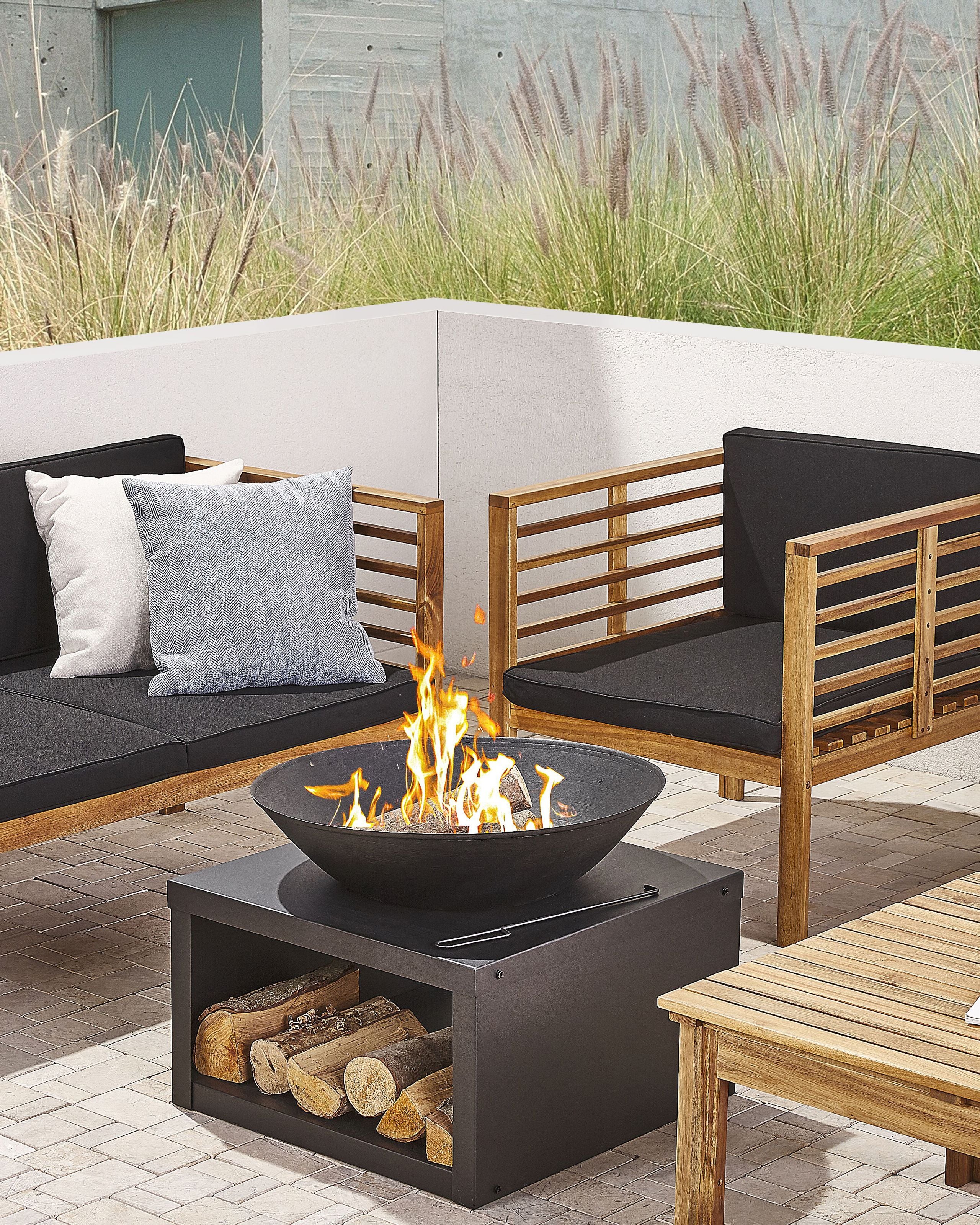 Moderni pyöreä tulisija säilytystilalla. Tässä modernissa tulisijassa yhdistyvät terassin lämmitys ja avotulen grillaus yhdessä kompaktissa yksikössä. Irrotettava grilliritilä peittää koko leveän tulisijan ja tarjoaa tilaa pihvien, vihannesten tai vaahtokarkkien valmistamiseen suoraan liekkien yllä. Ylimääräiset puu tai hiilet säilytetään kätevästi tulipesän alla olevalla avoimella hyllyllä, joten ne ovat aina käden ulottuvilla. Tehokas ilmanvaihto tulipesän ympärillä edistää tasaista palamista ja jakaa lämpöä ympäröiville istuinalueille. Säänkestävä jauhemaalattu teräsrakenne takaa kestävyyden ympäri vuoden, ja minimalistinen muoto luo selkeän, nykyaikaisen keskipisteen mihin tahansa puutarhaan tai terassille.