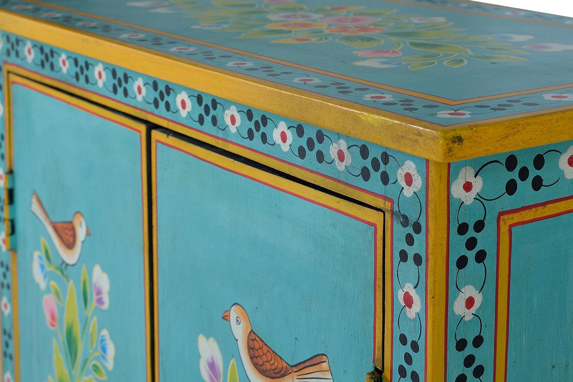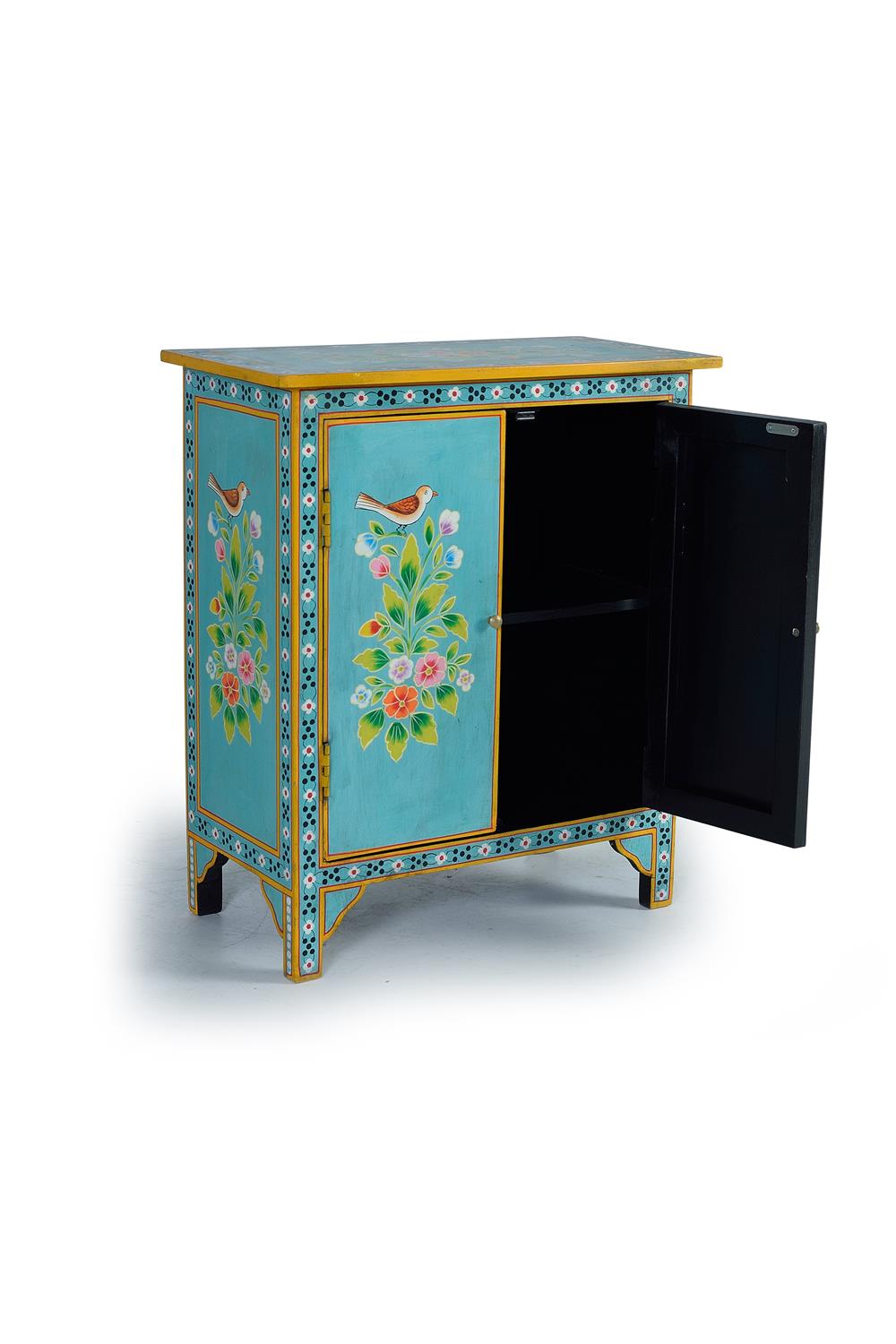 Tässä mangopuusta valmistetussa kappaleessa on kaksiovinen muotoilu ja käsinmaalatut yksityiskohdat, jotka lisäävät ainutlaatuisen käsityöläisyyden. Se on 77 cm korkea, 65 cm leveä ja 33 cm syvä, joten se sopii monenlaisiin tiloihin. Se painaa 15 kg ja toimitetaan 85 x 73 x 40 cm kokoisessa pakkauksessa. Tämä kappale yhdistää toiminnallisuuden ja tyylin, ja se on ihanteellinen tuomaan taiteellista ja käytännöllistä silausta sisustukseen. Koska kyseessä on luonnonpuusta ja käsintehty esine, siinä saattaa säilyä alkuperäiset oksankuviot ja syykuviot, mikä johtaa pieniin värivaihteluihin.