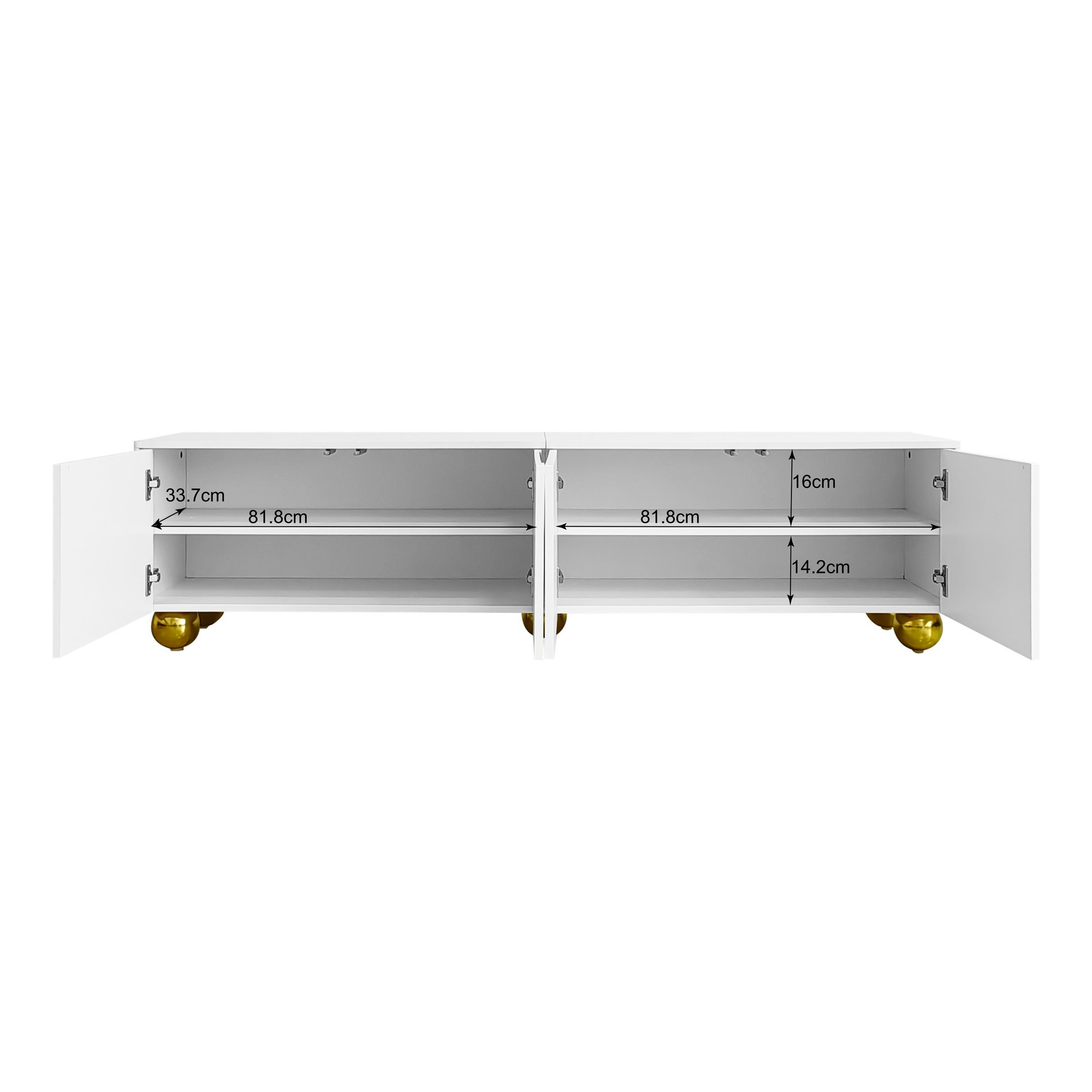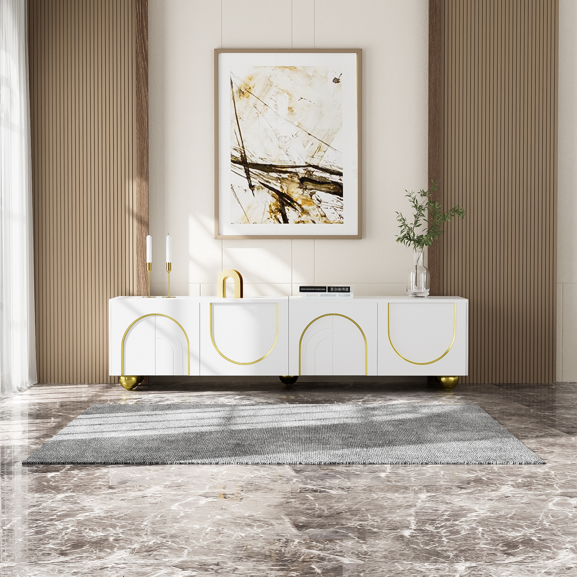 ELEGANTTI MUOTOILU: TV-tasossa on ylellinen muotoilu ja neljä ovea, joita koristavat kultaiset kaaret ja upeat kaiverrukset, jotka korostavat sen eleganttia ulkonäköä. ENSILUOKKAINEN RAKENNE: TV-tasoa tukee viisi pyöristettyä kultaista jalkaa, jotka lisäävät ripauksen ylellisyyttä ja varmistavat vakauden. INNOVATIIVISET OMINAISUUDET: Ovissa on tyylikäs painalluksella avattava mekanismi, ja pehmeästi sulkeutuvat saranat takaavat sujuvan ja hiljaisen toiminnan. KÄYTÄNNÖLLINEN SISÄTILA: Jokaisessa ovessa on piilotettu hylly, joka tarjoaa lisää säilytystilaa. Huomautus: Ovenpaneelien kulta on käsinmaalattu ja siinä voi olla joitakin epätäydellisyyksiä. Ominaisuudet.
